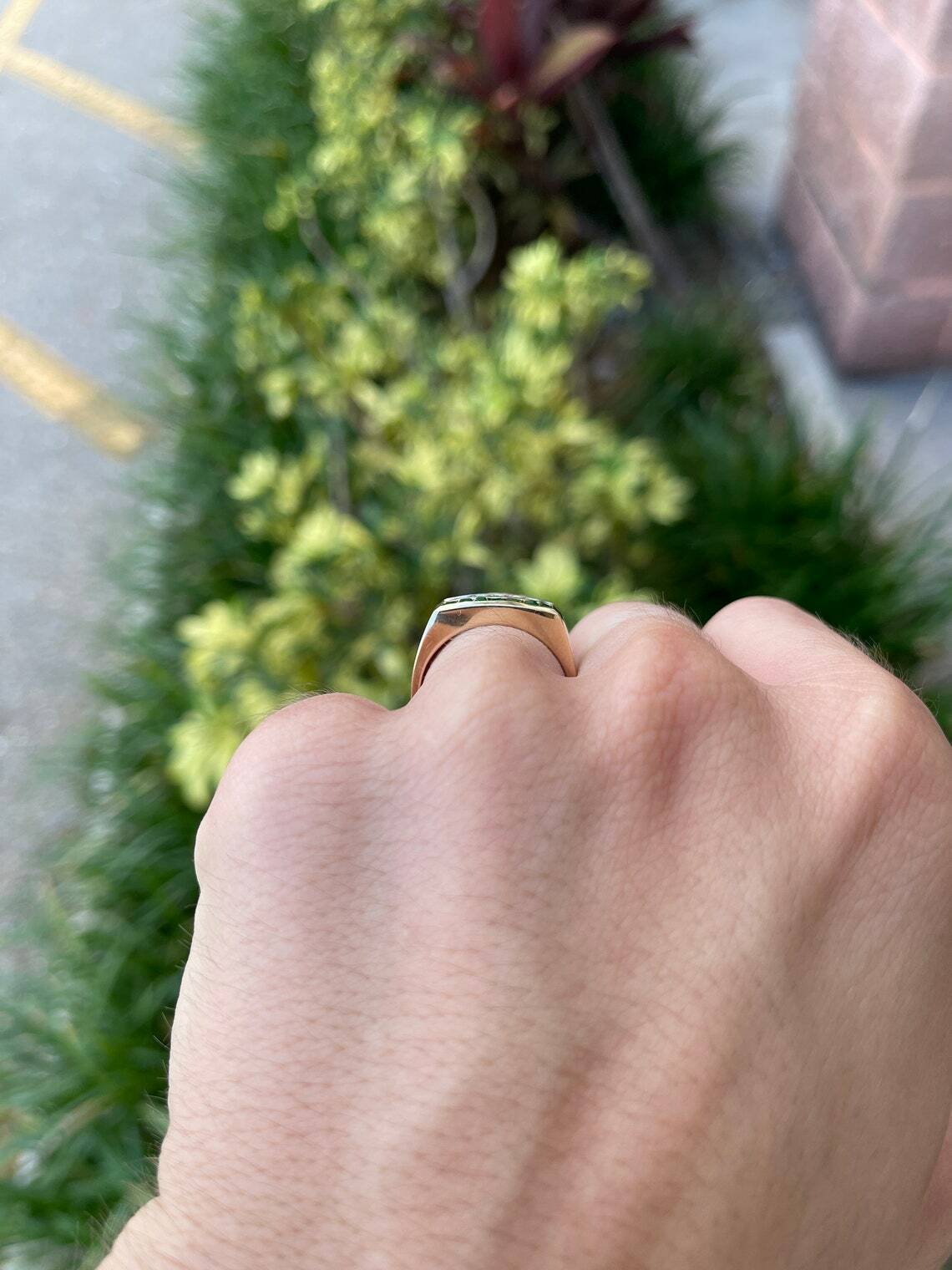 A mens' emerald and diamond channel set band. This band features natural baguette-cut emeralds and brilliant round diamonds. Each emerald has been meticulously hand-selected to ensure maximum quality. The smooth band is wide and comfortable for daily wear.