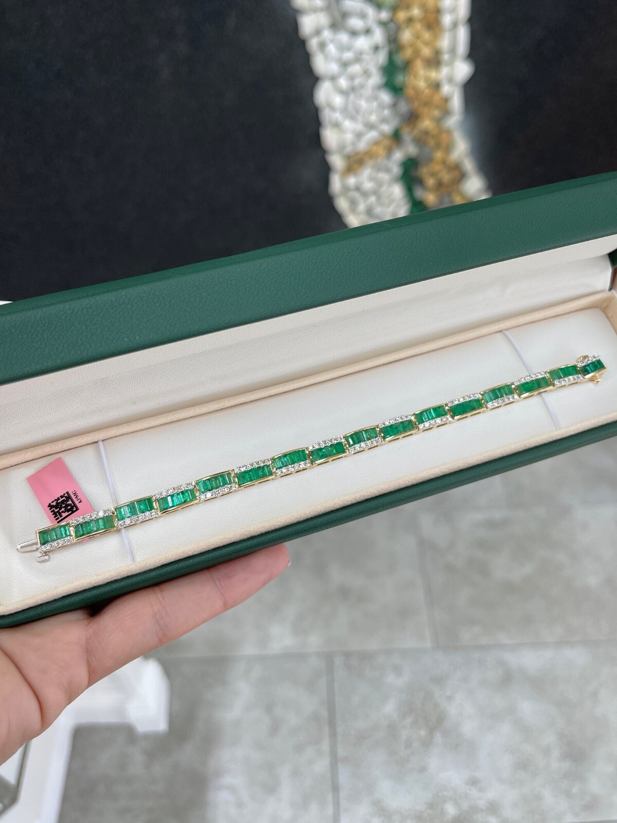 A luxurious emerald and diamond bracelet. This extraordinary piece features multiple elongated emerald cut emeralds that showcase a divine medium dark green color, followed by good clarity and even better luster that really speaks for themselves. Numerous petite brilliant round cut diamonds accent the edges on both ends to lighten up your look. Crafted in gleaming 14K gold, and measures seven and a half inches in length.