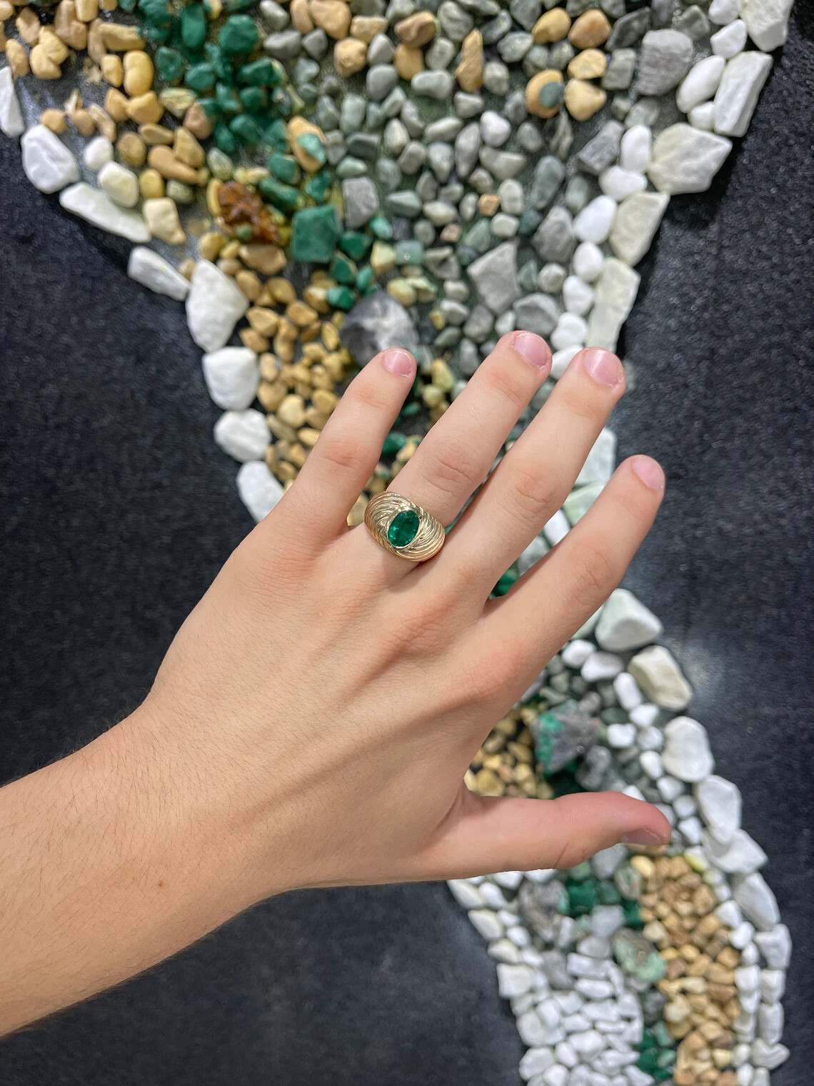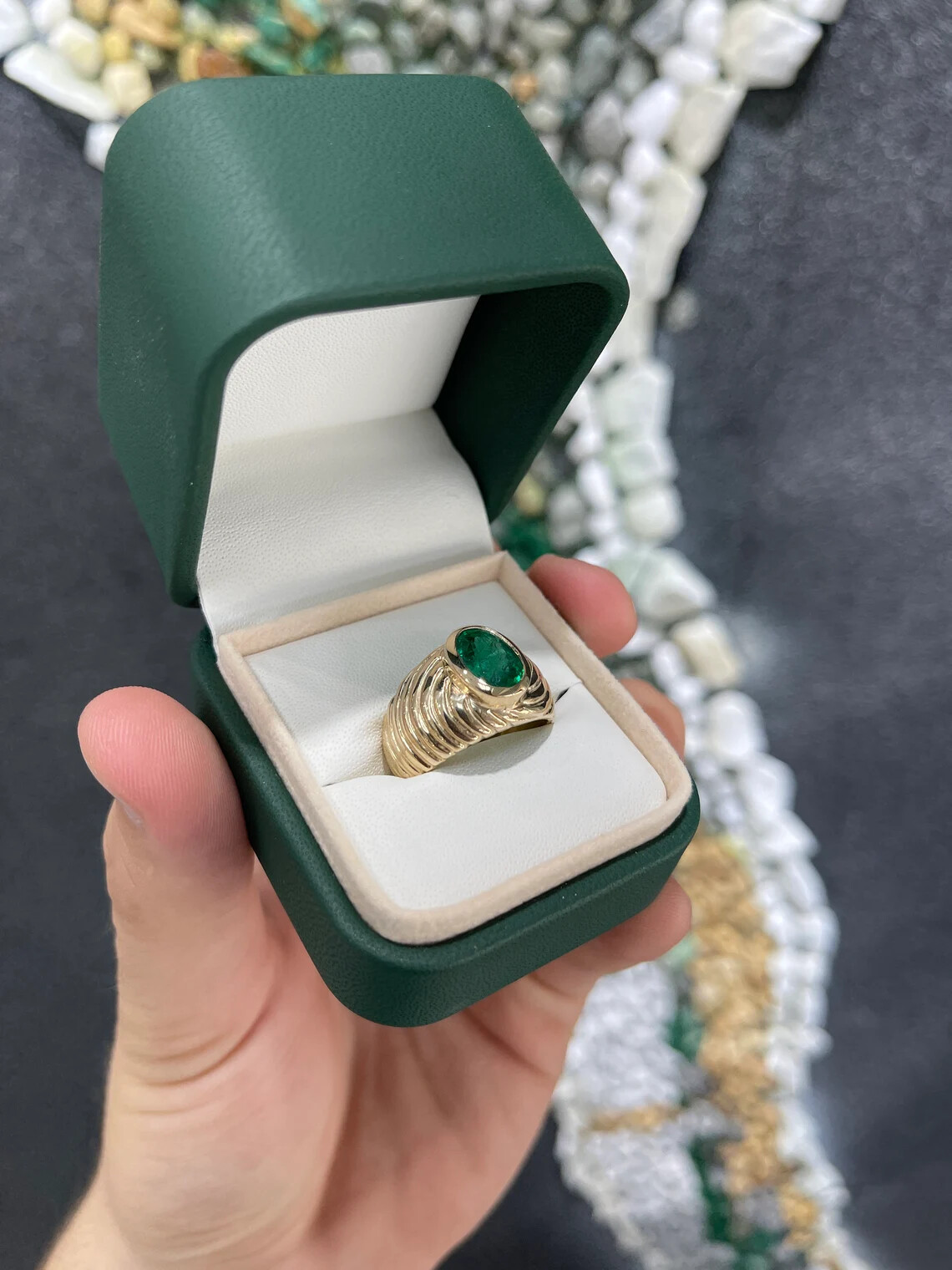 A custom-made, men's natural emerald solitaire ring made in 14K yellow gold. The earth-mined oval cut Zambian emerald is natural, and fine quality; with excellent luster and unique characteristics. The emerald is bezel set in a secure golden frame, ideal for daily wear. Engraved lines on the band add texture and beauty. The color of this emerald intensifies once worn.