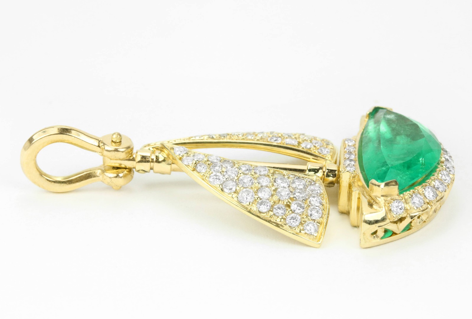 Displayed is an exquisite, unisex, completely handmade, and exclusive sailboat Colombian emerald necklace. This masterpiece was expertly handmade to perfection in substantial solid yellow gold. A diamond-encrusted mainsail and jib were dexterously designed to move freely as it shifts on the mast of the sailboat, making this piece come to life. The hull encompasses a stunning crescent shape Colombian emerald faceted/cut specifically for this pendant. The ethically mined Muzo emerald weighs an impressive AAA 5.23cts and has beautiful eye clarity and a soothing medium vivid green color. The Colombian emerald features high-quality characteristics and substantial statement size. Pave set diamonds are also found on the keel and topside. A large bail will allow average to largely sized chains to easily slide through.