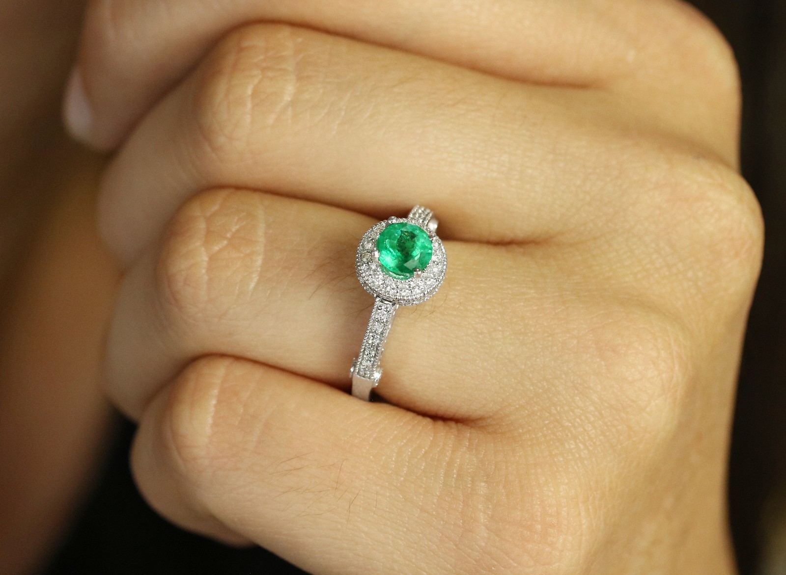 Color and brilliance can best describe this rare round Colombian emerald and diamond engagement ring 14K. The luminous, round DEEP green Colombian emerald has amazing qualities that make it exclusive. The emerald is set in a secure four prong setting and is accented with round diamonds in a halo setting. More diamonds accent the beautifully detailed gallery. The combination of both larger and smaller stones make for a spectacular brilliance and design.