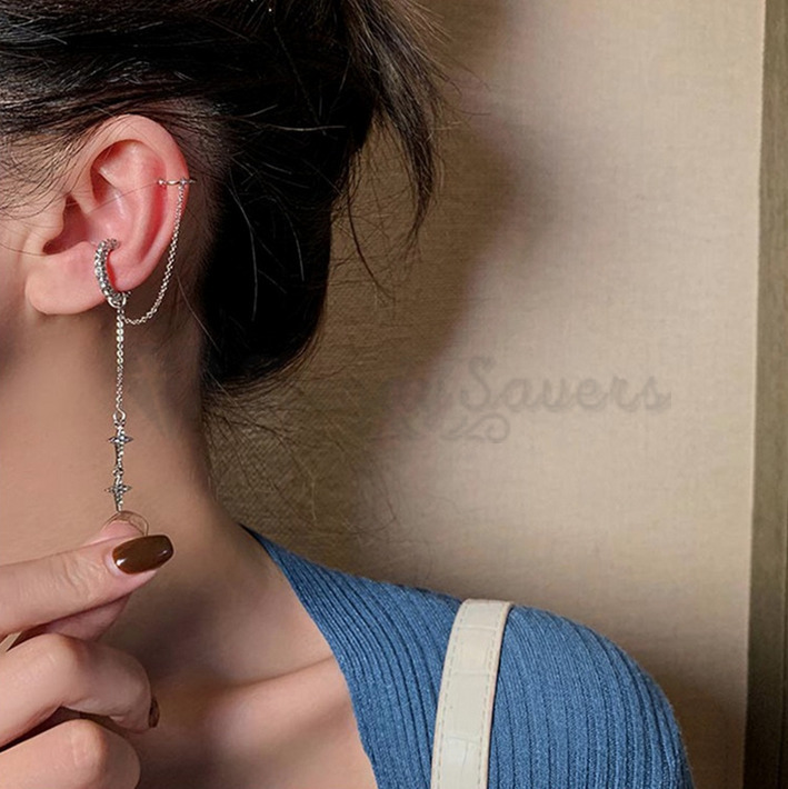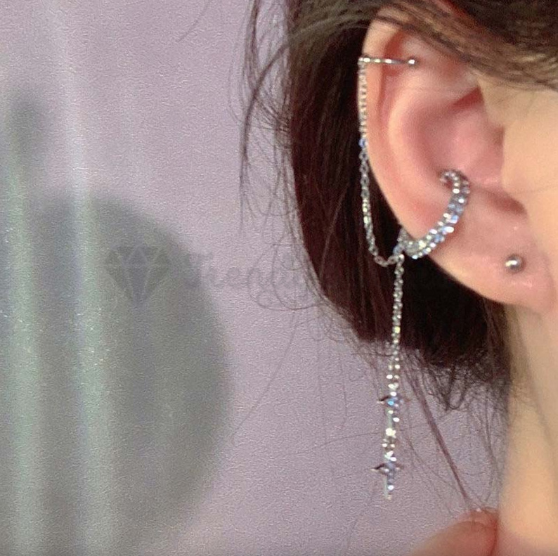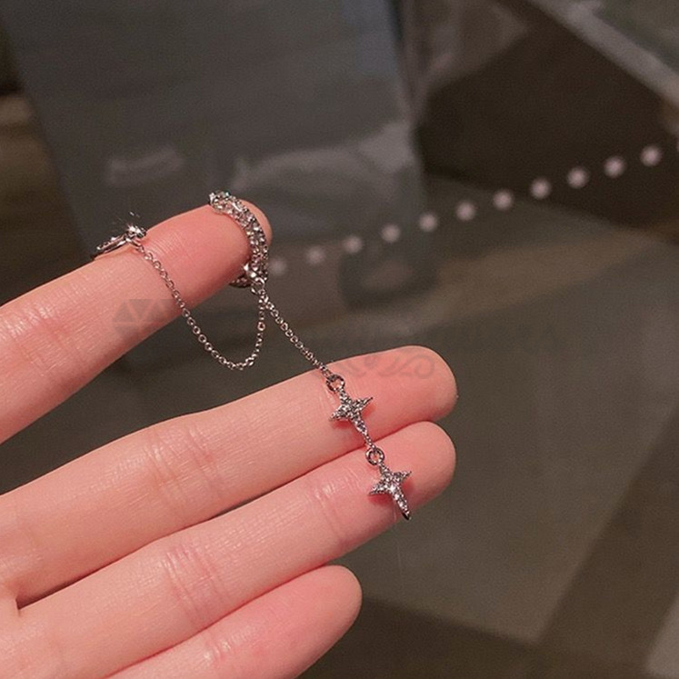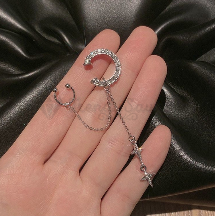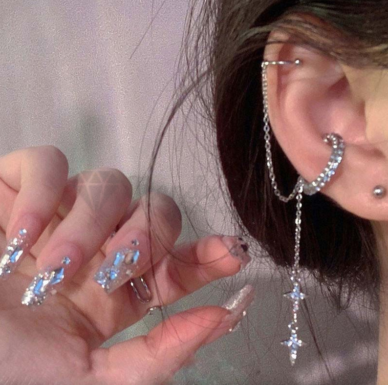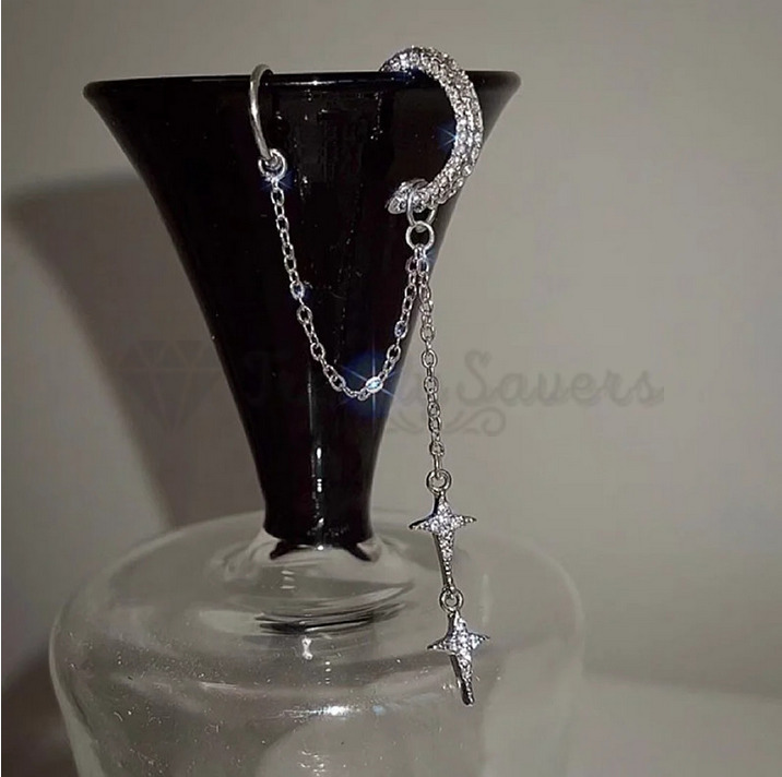 Moon Star Rhinestone Chain Geometric Tassel Earring Sterling Silver Ear Cuff 1pc
