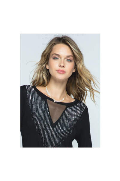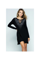 A statement dress suitable for any special occasion. Hard to believe such a sumptuous dress can also be super comfortable. Stunning stone detail on dress front with a striking black mesh inset. Hemline is slightly Hi-Lo, with back about 3" longer.. 95% Rayon; 5% Spandex. Dry Clean or Hand Wash Cold. Made in USA