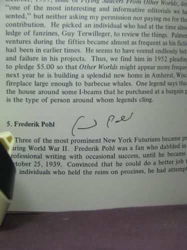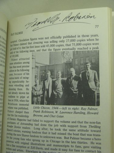 Description: Trade paperback book published by Advent: Publishers in 1971. The copyright page states 'First Edition, April 1969', 'Second Cloth Printing, March 1971', and 'First Paperback Printing, March 1971', no further printings are listed. Signed by Frank M. Robinson and Frederik Pohl on pages 78 and 79 where it talks about their contributions to science fiction and fandom in the forties.