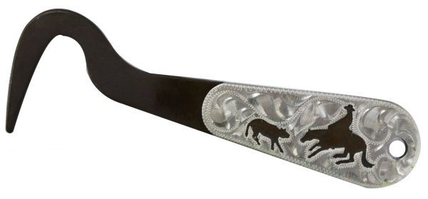 Showman cutting horse brown steel silver engraved hoof pick. Measures 6" long.