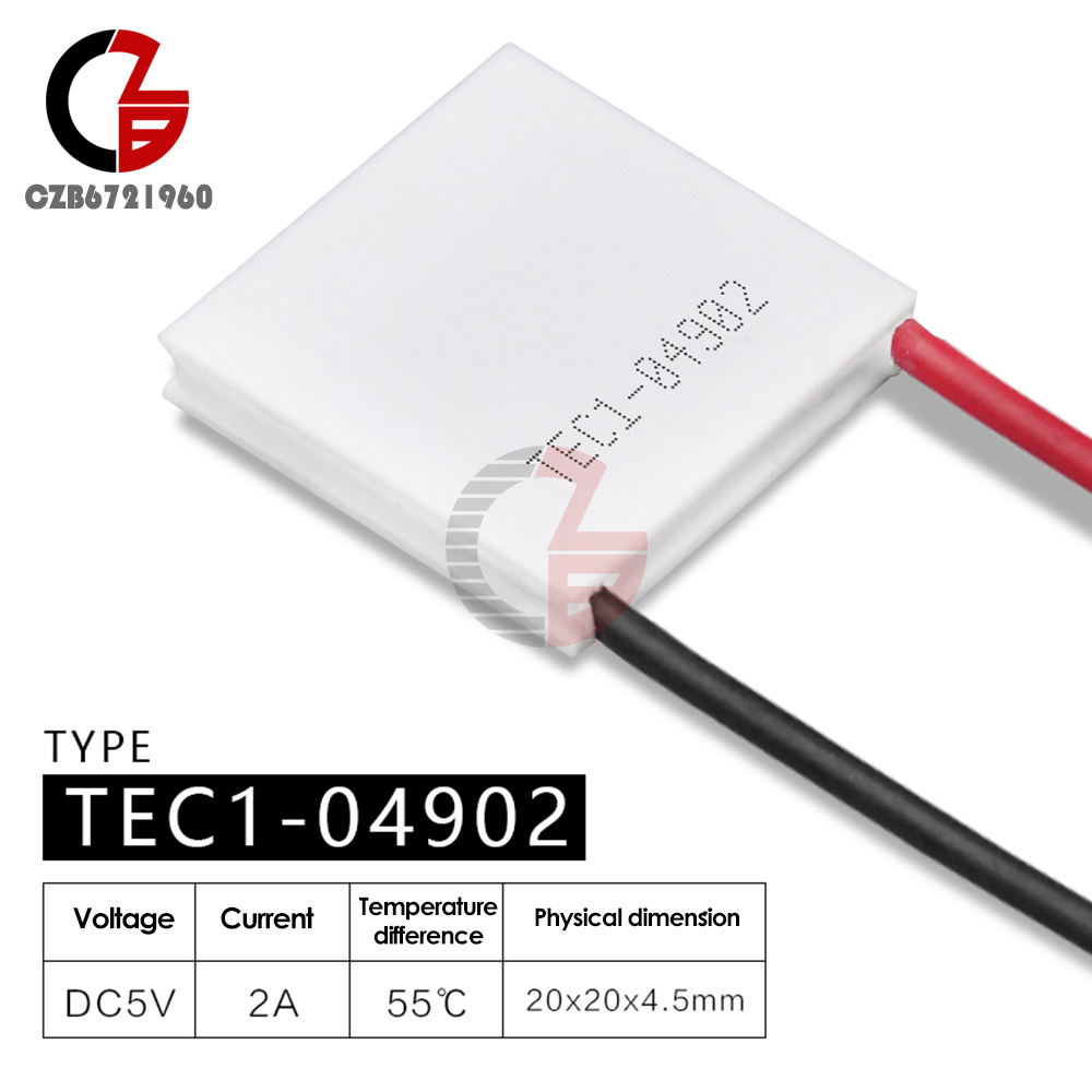 Thermoelectric Cooling ModuleEco-friendly, no refrigerating fluid is usedCompact size and light-weightNoiseless, reliable and maintenance-friendlyCooling or heating by changing current directionModel: TEC1-04905Rated Voltage: 5V DCMax.Current: 5AMax.Temperature Difference: 67 deg CMax.Voltage: 6.2VMax.Refrigerating Power: 19.4WCouples: 49Size (L x W): Approx.1 x 1inch / 25 x 25 mmCable Length: Approx .5.9 inch / 15 cmColor: WhiteWiring: Red line for anode, Black line for cathode.