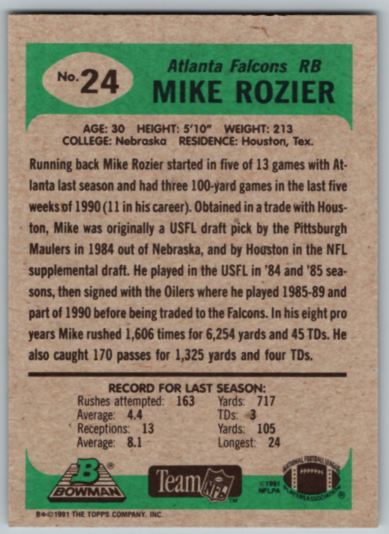 | Description: | Mike Rozier | | Category: | Football | | Year: | 1991 | | Product: | Bowman | | Team: | Atlanta Falcons | | Card Number: | 24 | | Dimensions: | 3¼" x 2¼" |