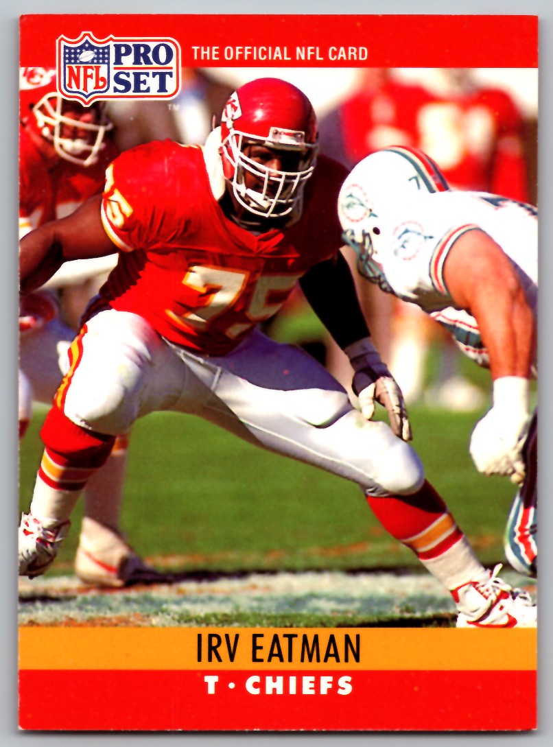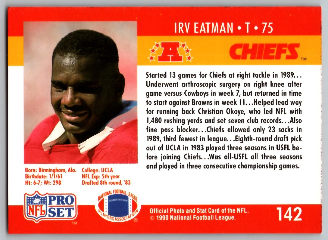 | Description: | Irv Eatman | | Category: | Football | | Year: | 1990 | | Product: | Pro Set | | Team: | Kansas City Chiefs | | Card Number: | 142 | | Dimensions: | 3¼" x 2¼" |