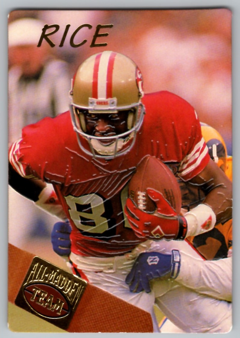 | Description: | Jerry Rice | | Category: | Football | | Year: | 1994 | | Product: | Action Packed The All-Madden Team | | Team: | San Francisco 49ers | | Card Number: | 4 | | Dimensions: | 3½" x 2¼" |