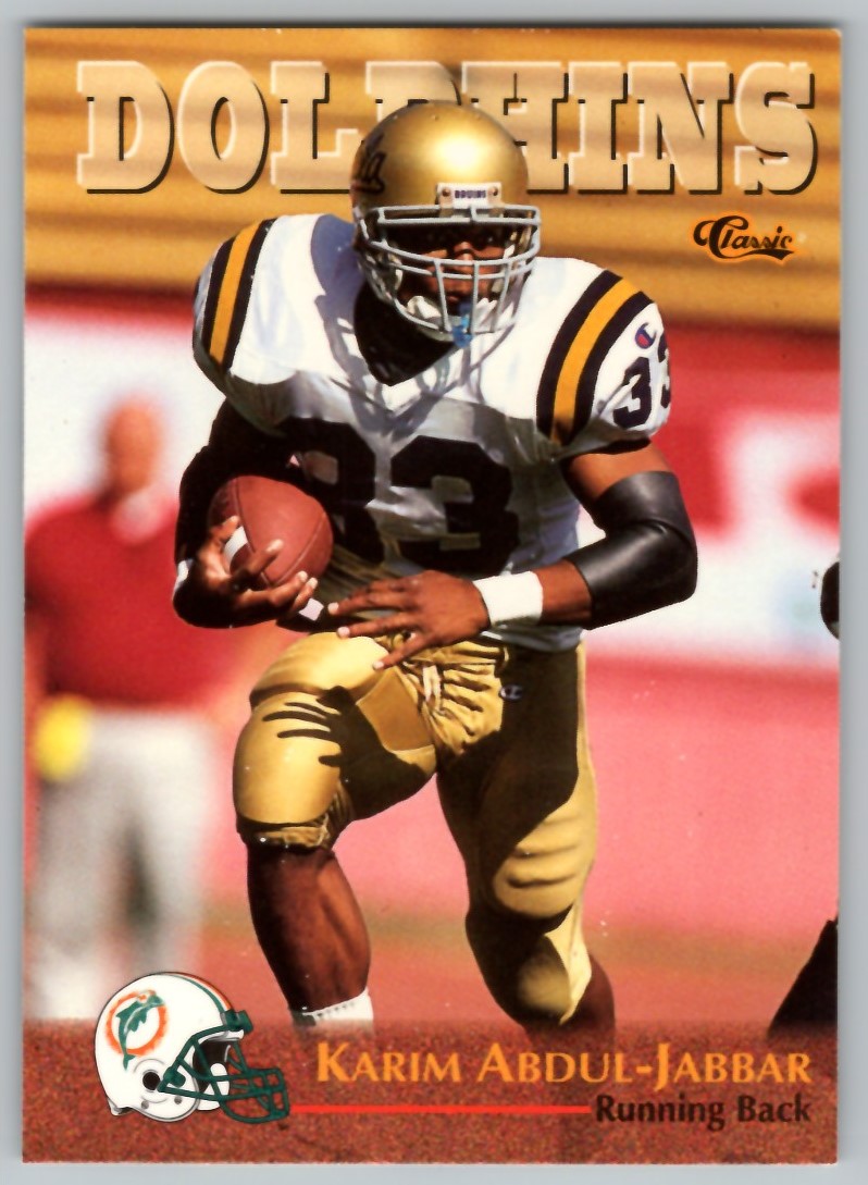 | Description: | Karim Abdul-Jabbar | | Category: | Football | | Year: | 1996 | | Product: | Classic NFL Rookies | | Team: | Miami Dolphins | | Card Number: | 10 | | Dimensions: | 3¼" x 2¼" |