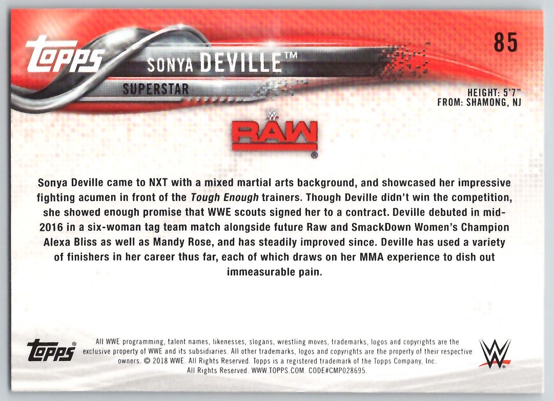 | Description: | Sonya Deville | | Category: | Wrestling | | Year: | 2018 | | Product: | Topps WWE | | Card Number: | 85 | | Dimensions: | 3¼" x 2¼" |