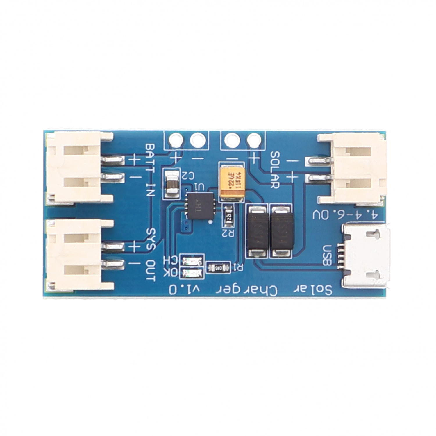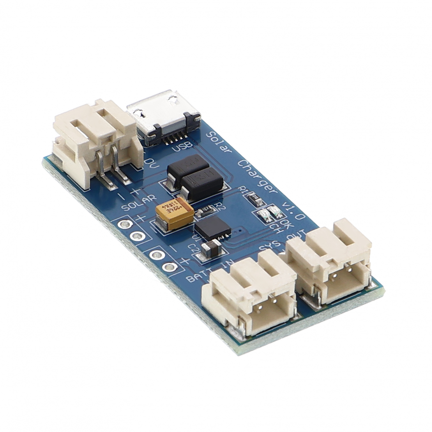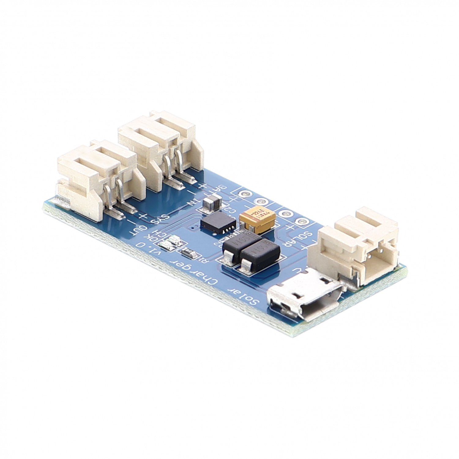 An den drei JST-PH-Buchsen lassen sich ein Akku, ein Solarmodul und eine Verbraucherschaltung anschließen.