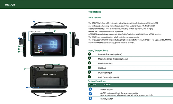 ------------------------------------------------------------------------------- DT317CR with 7” TFT display is powered by the Intel® Atom™ quad‐core processor, offering optimal combinations of performance and power savings. The DT317CR is available with Microsoft® Windows® operating systems. Each software operating system features web browser, client/ server computing software, media player, accessories, and applications support. PACKAGE CONTENTS • One DT317CR with Battery Pack • AC‐DC Power Adapter with Power Cord • Basic Operation Guide DT317CR Input/ Output Ports Magnetic Stripe Reader Headphone Jack USB Port DC Power Input Back Camera (optional) Button Functions BUTTON ACTION Power button As SAS button without the scanner module As scanner trigger when equipped with the scanner module Battery switch. |