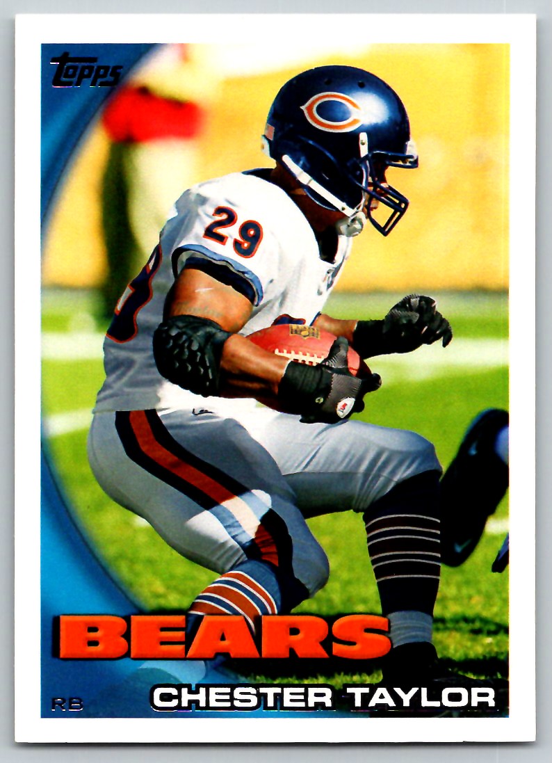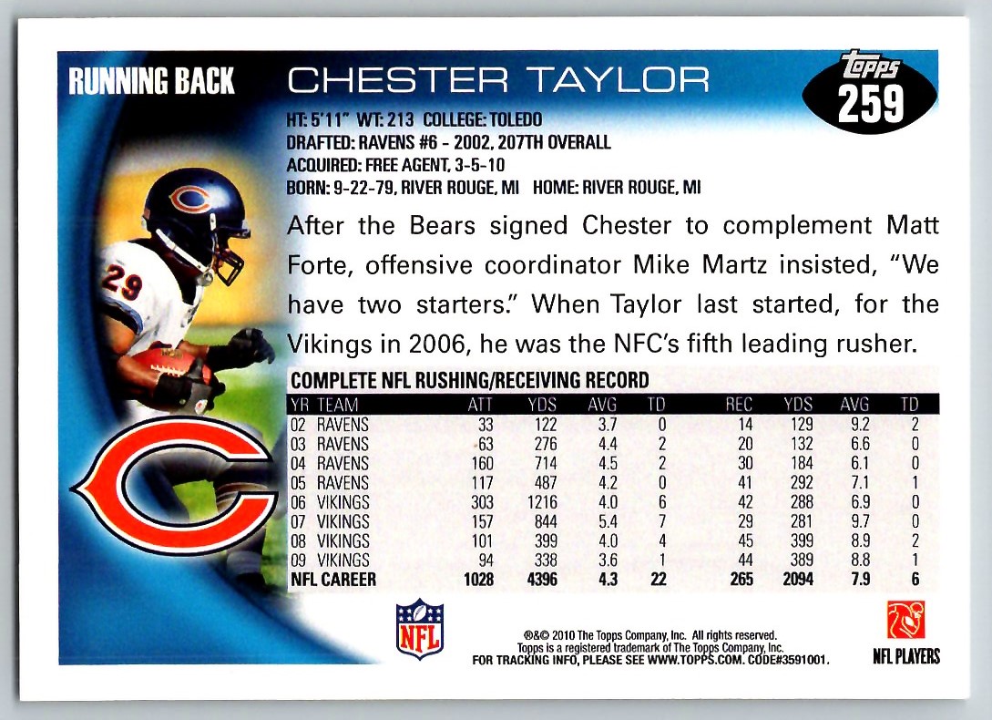 | Description: | Chester Taylor | | Category: | Football | | Year: | 2010 | | Product: | Topps | | Team: | Chicago Bears | | Card Number: | 259 | | Dimensions: | 3¼" x 2¼" |