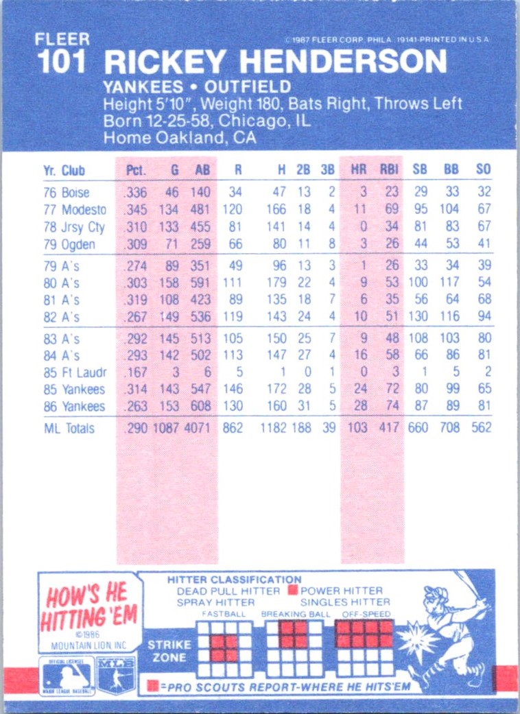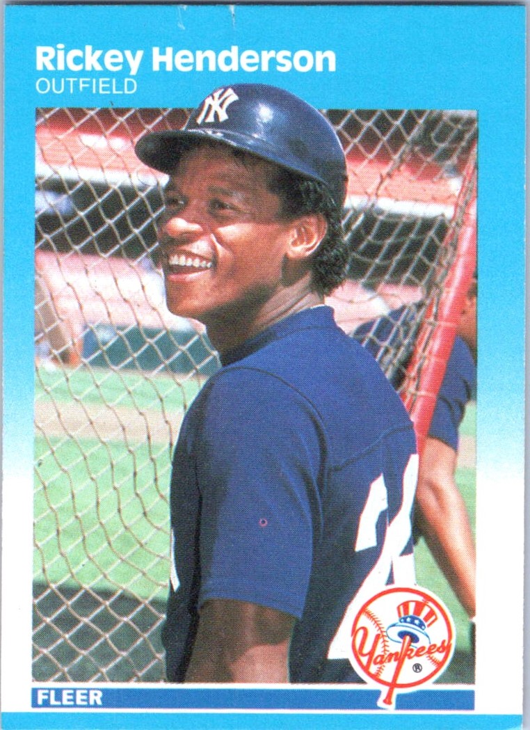 | Description: | Rickey Henderson | | Category: | Baseball | | Year: | 1987 | | Product: | Fleer | | Team: | New York Yankees | | Card Number: | 101 | | Dimensions: | 3¼" x 2¼" |