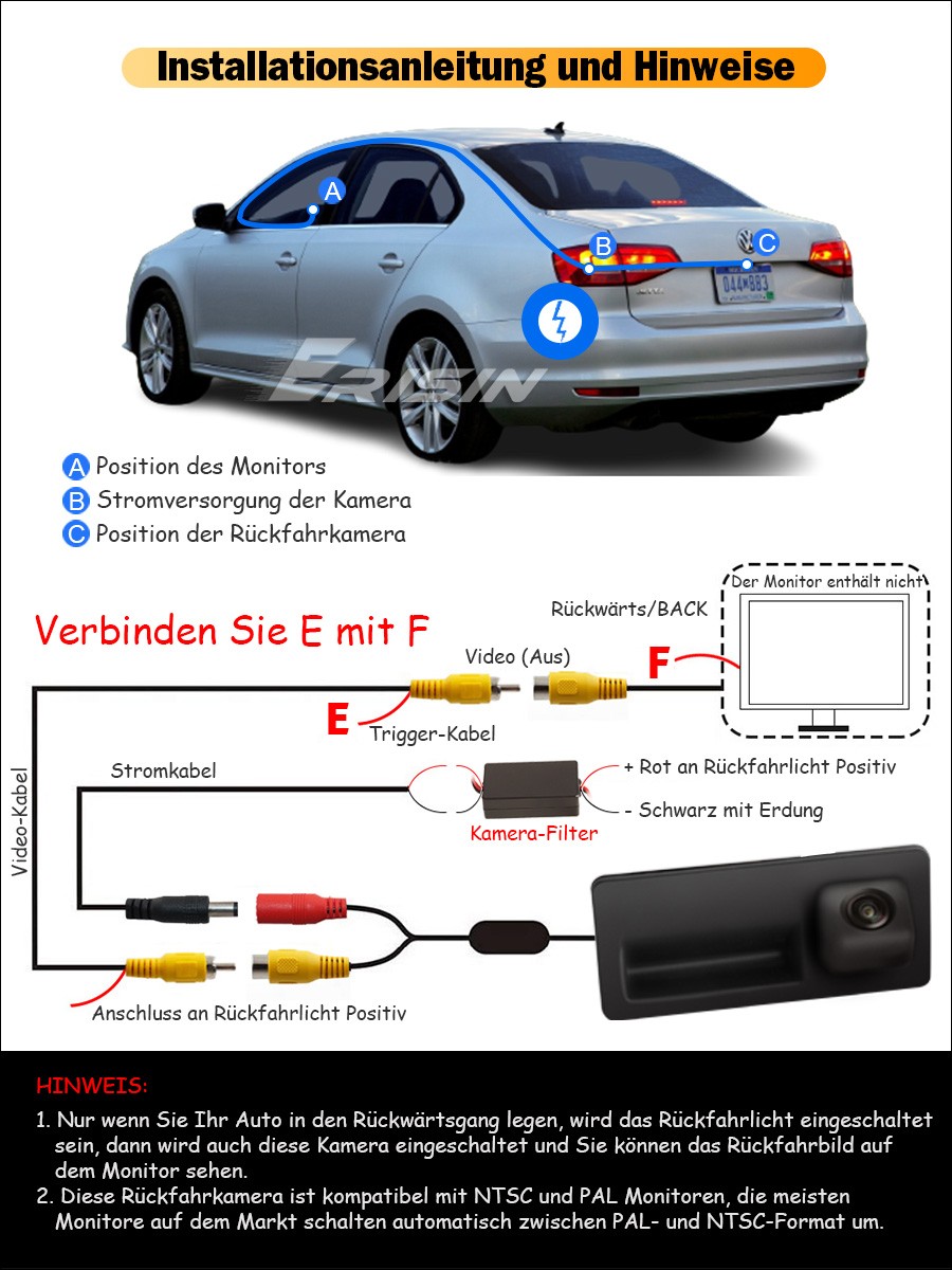 - Für VW/Audi-Auto mit Original-Autoradio installiert (NICHT direktes Plug & Play, Ihr Auto muss vorher mit einem Kamera-Decoder ausgestattet sein.