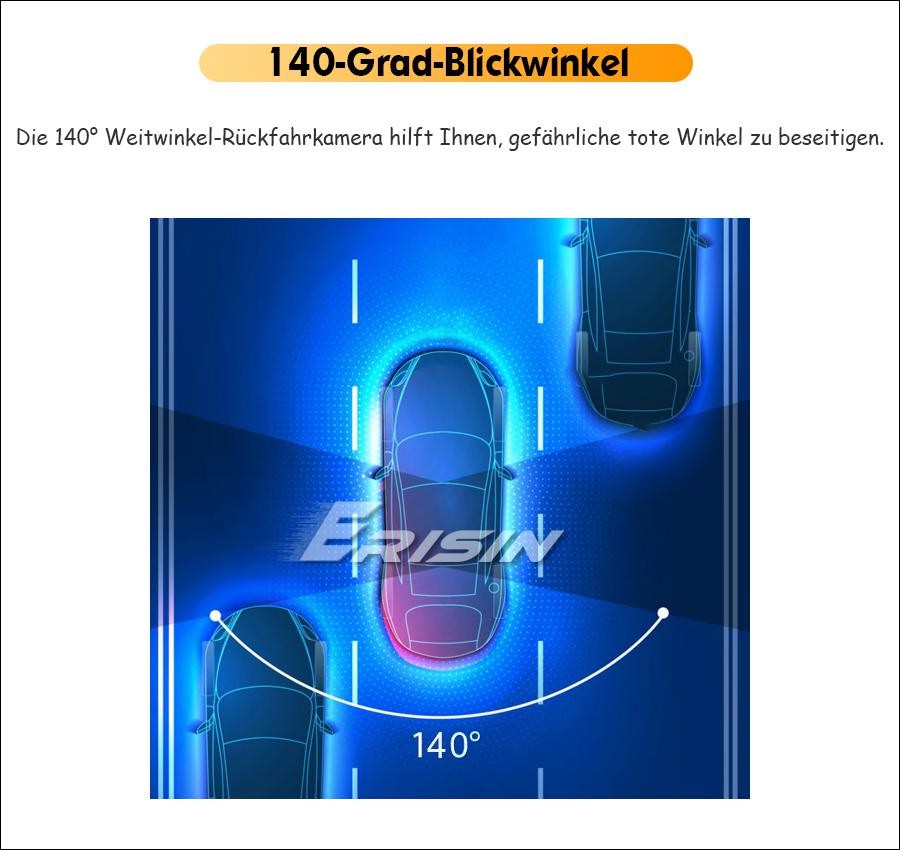 Rückfahrkamera mit 140°-Blickwinkel, die eine Vielzahl von Landschaften projiziert und tote Winkel beim Fahren so weit wie möglich eliminiert. Ein Auto mit einer langen Karosserielänge neigt dazu, einen hinteren toten Winkel zu haben, so dass die Installation dieser Rückfahrkamera Kollisionen mit Hindernissen verhindern und sicheres Fahren ermöglichen kann.