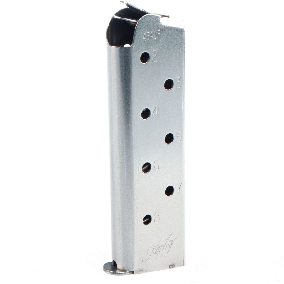 This is a set of Kimber factory original magazines designed for 1911 pistols chambered in .45 ACP with a full-length grip. Each magazine holds 8 rounds and features a stainless finish. Built to Kimber’s specifications for reliable performance, these magazines are also pre-drilled for base pad installation.