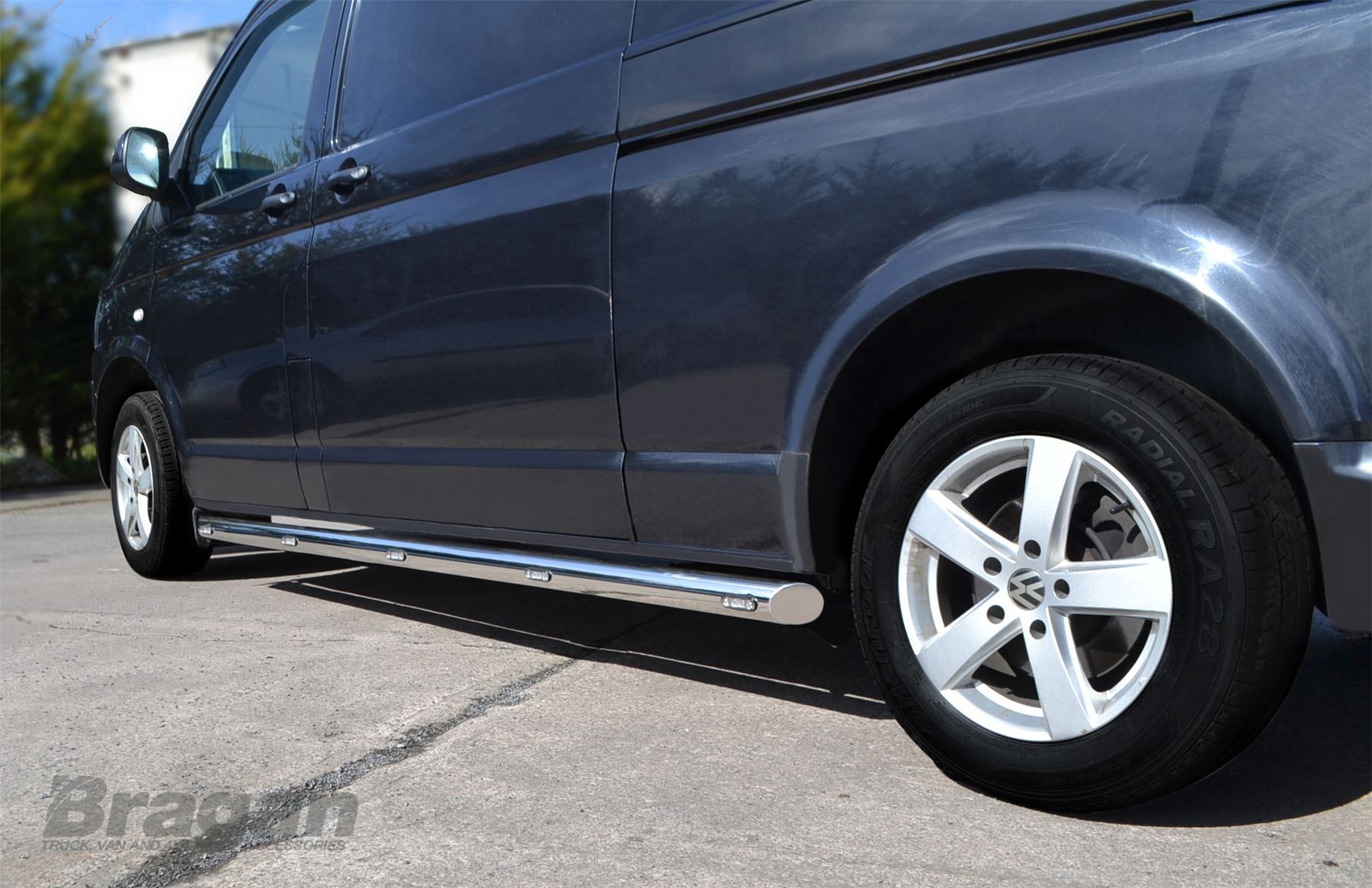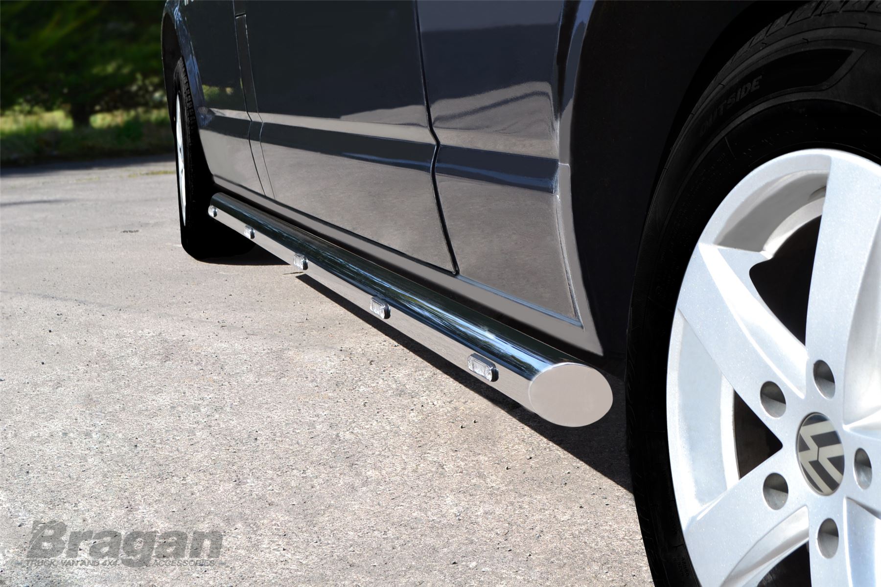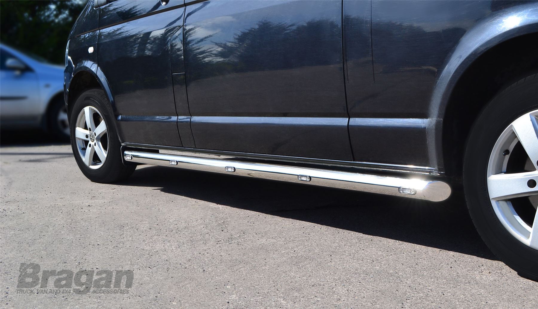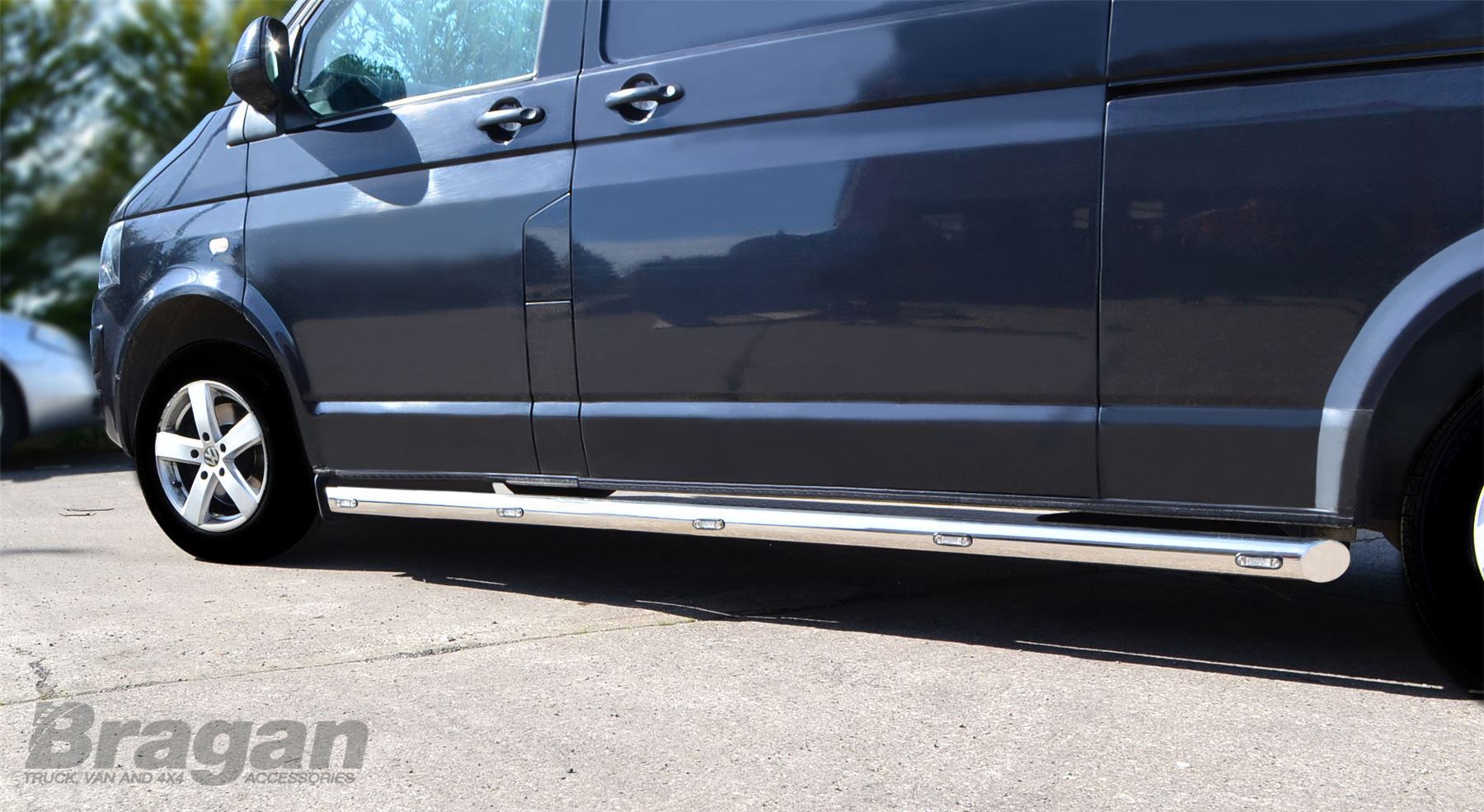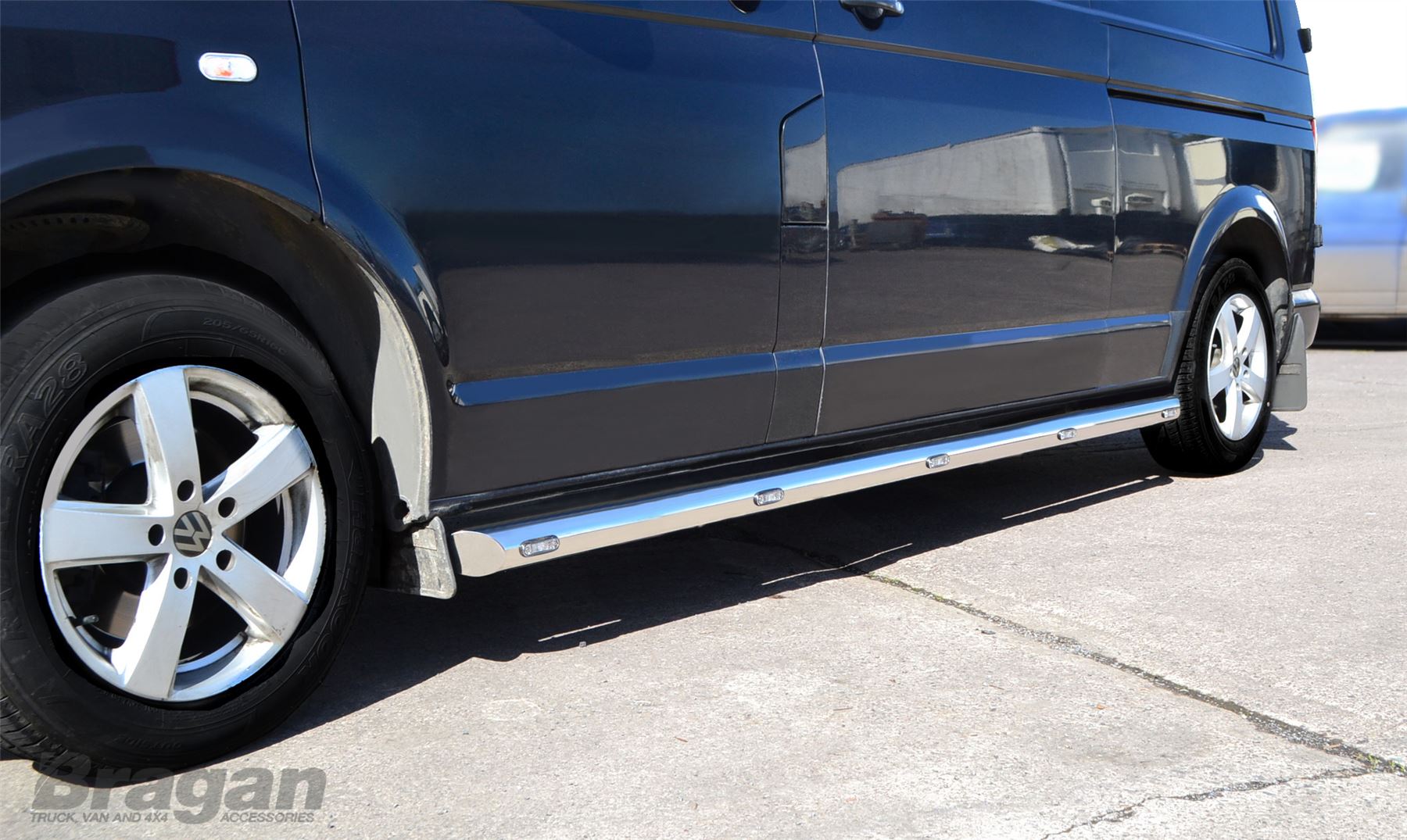 High quality Stainless Steel Side Bars - set of 2 (Pair) + Amber LEDS x10 for Volkswagen Transporter T5 / Caravelle LWB (2004 - 2015 model). These top of the range side bars will have your vehicle looking top spec at a fraction of the cost of the genuine items but with the same high quality.