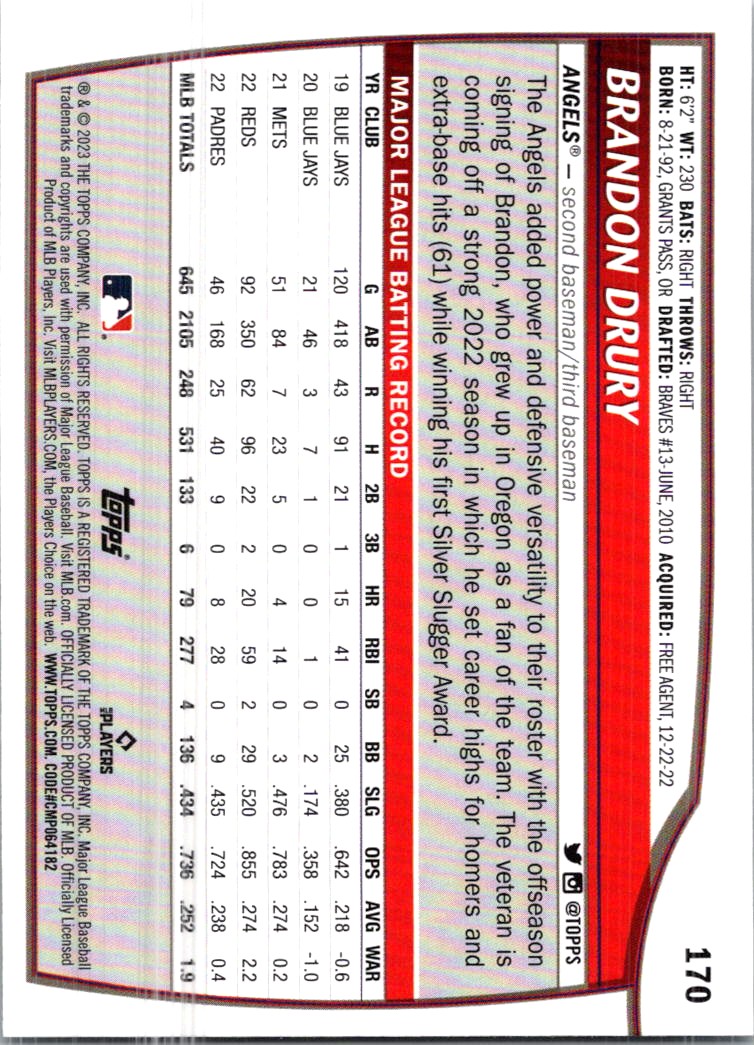 | Description: | Brandon Drury | | Category: | Baseball | | Year: | 2023 | | Product: | Topps Big League | | Team: | Los Angeles Angels | | Card Number: | 170 | | Dimensions: | 3¼" x 2¼" |
