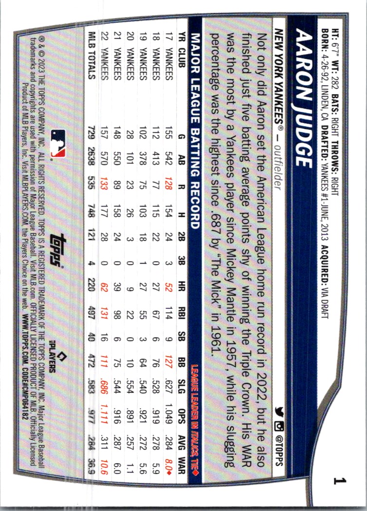 | Description: | Aaron Judge | | Category: | Baseball | | Year: | 2023 | | Product: | Topps Big League | | Team: | New York Yankees | | Card Number: | 1 | | Dimensions: | 3¼" x 2¼" |