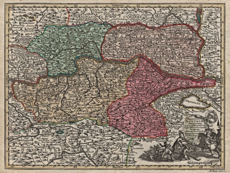 LOWER AUSTRIA: Kst. card, v. AC Seutter b. M. Seutter, 'Archiducatus Austriae inferioris...', with old surface coloring, around 1745, 19.3 x 25.5 with pretty fig. Cartridge. - Area between Steyr and Preßburg. Article number: 23379