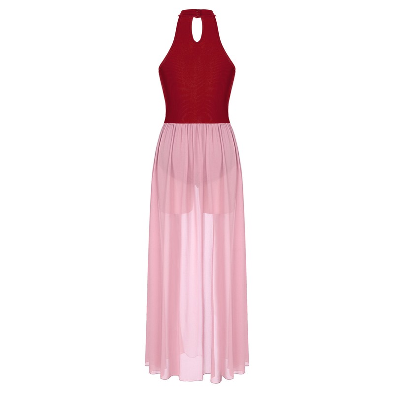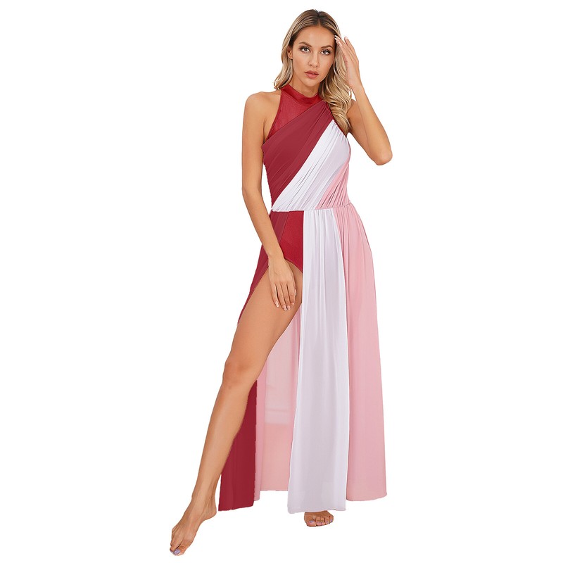 Sleeveless dance dress for women, color block design, bodice top with ruched chiffon overlay, unique and stylish.