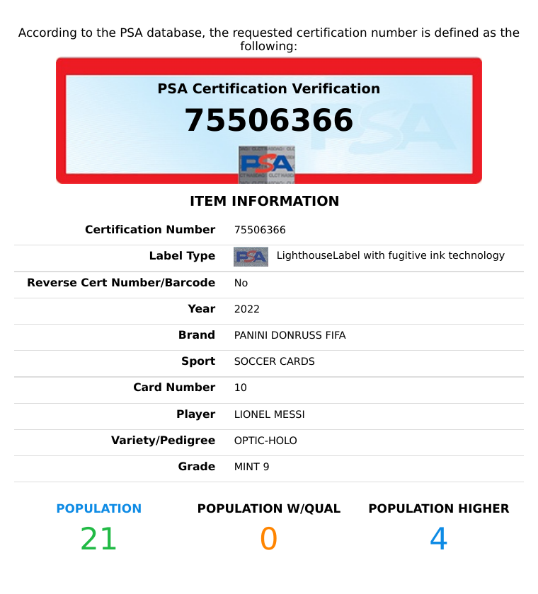 2022 PANINI DONRUSS FIFA LIONEL MESSI #10 OPTIC-HOLO ARGENTINA PSA 9 MINT