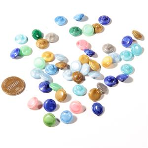 Lot (50) Czech Bohemian vintage mixed satin doll size glass buttons. A mix of pink, blues, green and brown satins. Outstanding examples of late vintage press molded glass buttons. Please note each bag will have a slightly different mix of colors.