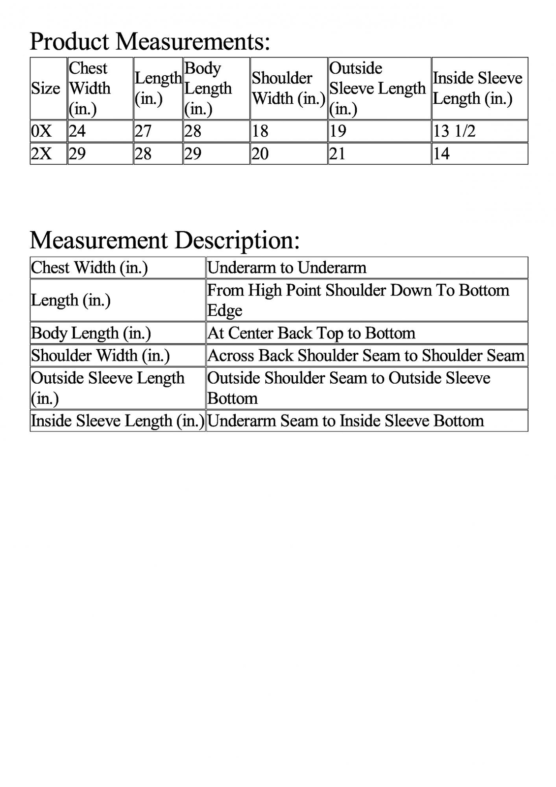 SizeChest Width (in.)Length (in.)Body Length (in.)Shoulder Width (in.)Outside Sleeve Length (in.)Inside Sleeve Length (in.)