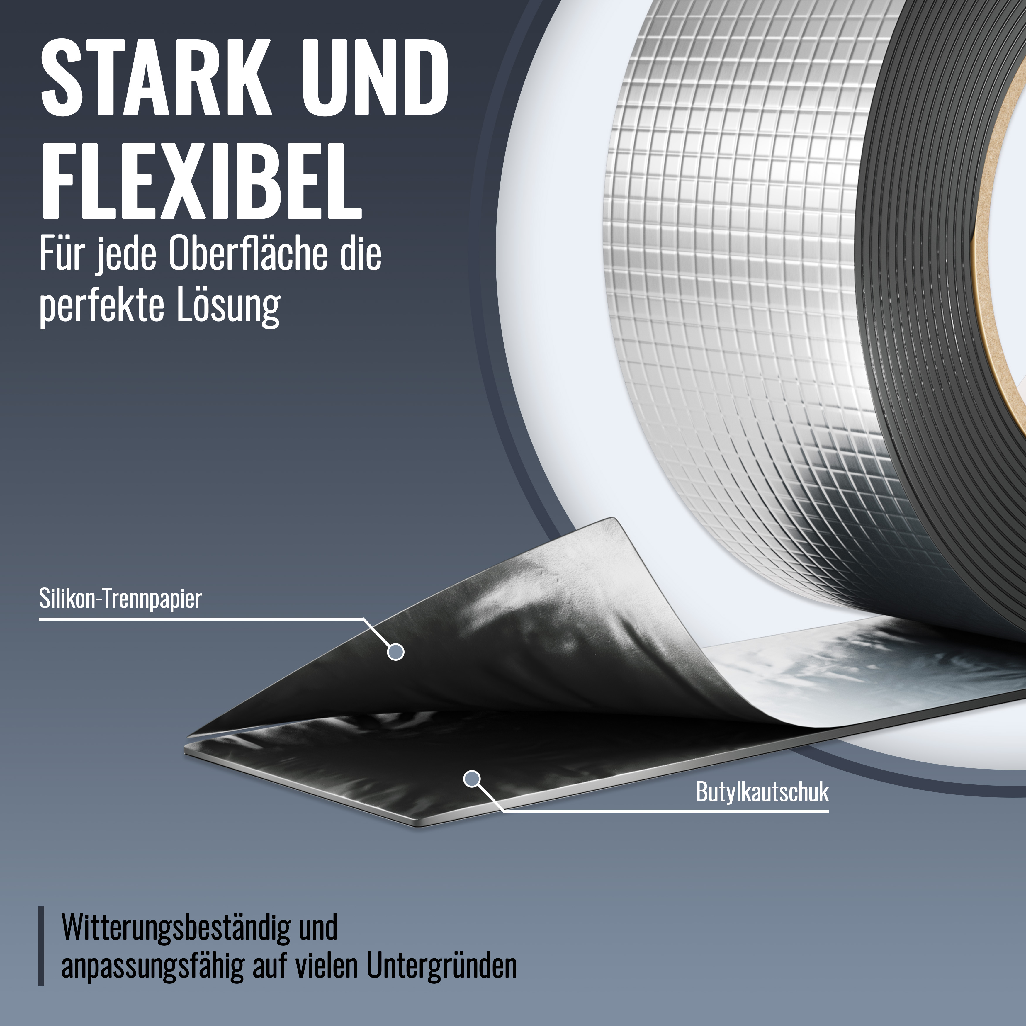 Das Poppstar wasserdichte Klebeband aus Butyl-Kautschuk ist ein echtes Super-Klebeband: Es eignet sich zum Abdichten auf glatten, geraden und sogar unebenen Oberflächen, da es einfach aufgedrückt wird. Die einseitige Alukaschierung sorgt für eine zuverlässige Abdichtung gegen Regen, Wasserdampf, Öl und vieles mehr. Daher eignet sich das Dichtband wasserdicht ideal als Dachrinnen-Dichtband, als Blechdach-Abdichtung oder als Dampfsperre bei Rissen in der Dachfolie.