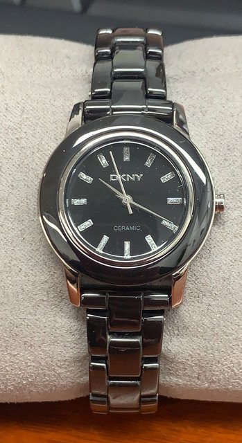 Watch Information: Gender: Women's Case Size: 28mm Dial Color: Black Material Case: Ceramic Material Band: Ceramic Diamonds: n/a Movement: Analog Quartz Water Resist: 50 Meters Water Resistant Features: Analog Additional Info: Packaging: DKNY Box & Papers