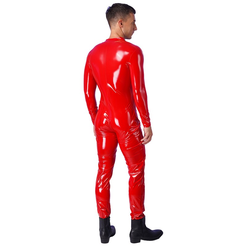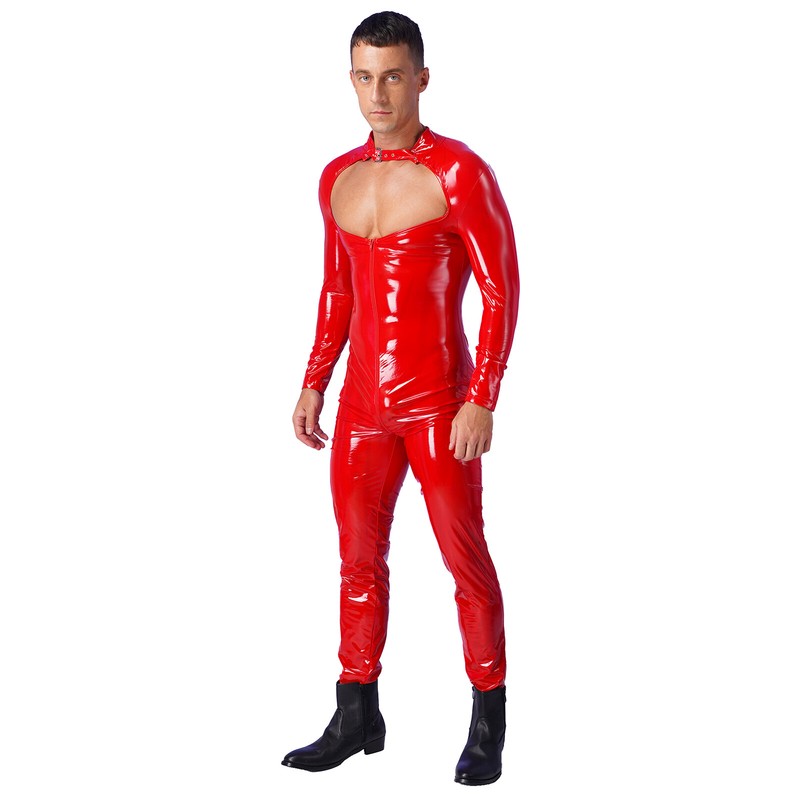 Patent leather cosplay costume long sleeve cut out zipper crotch bodysuit for men.