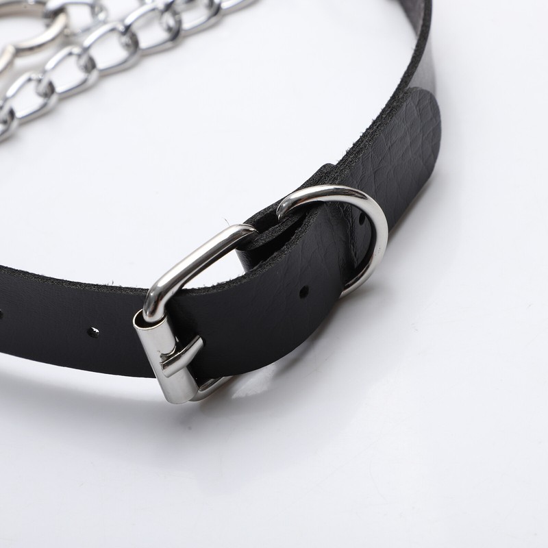 Adjustable spaghetti shoulder straps, open cups, metal rings linked at bust.