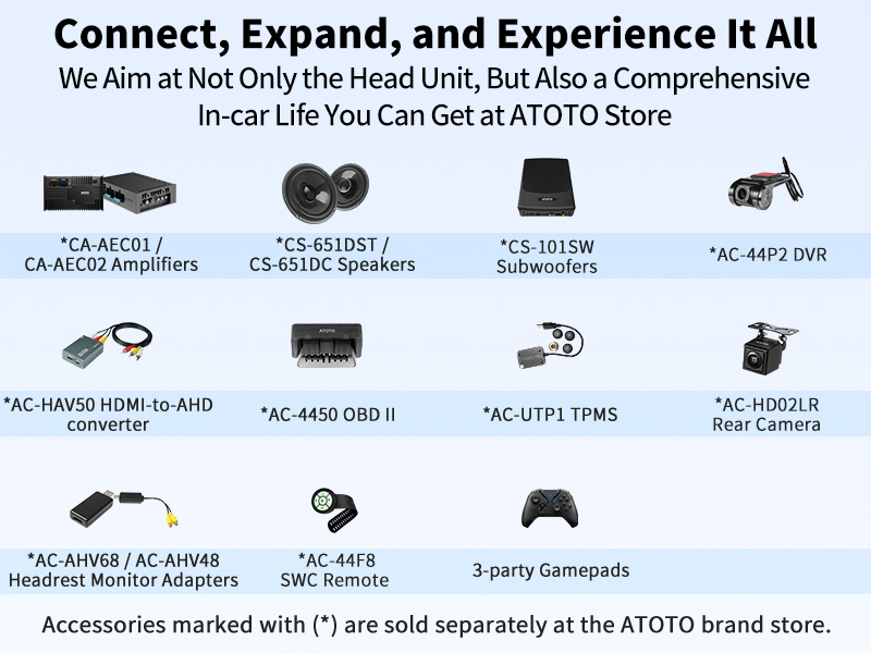 | Verbessern Sie Ihr Fahrerlebnis mit den neuen ATOTO-Zubehörteilen: CIEFLT01B Fußraumbeleuchtung für Ambiente, eine kabellose Rückfahrkamera (WRCEHD10LRB) für einfaches Rückwärtsfahren und ein ACEHBV86B HDMI-zu-USB-Adapter für reibungslose Konnektivität, alles kompatibel mit dem A6 PF. Alle genannten Zubehörteile werden separat im ATOTO-Markenstore verkauft. Schauen Sie sich unser Video an, um einen kompletten Überblick zu erhalten | Da der A6 PF ein universelles Autoradio ist, könnten für bestimmte Fahrzeuge zusätzliche Zubehörteile nötig sein (nicht im Paket enthalten). ATOTO bietet das SBV (Suche nach Fahrzeug)Werkzeug an. Geben Sie Fahrzeugdetails ein, um passendes Zubehör und Installationsmaterialien zu finden, wie Armaturenbrett-Sets, Kabel und Antennenadapter. Kosten für Zubehör und Installation tragen die Kunden; diese sind nicht bei ATOTO inbegriffen.. |