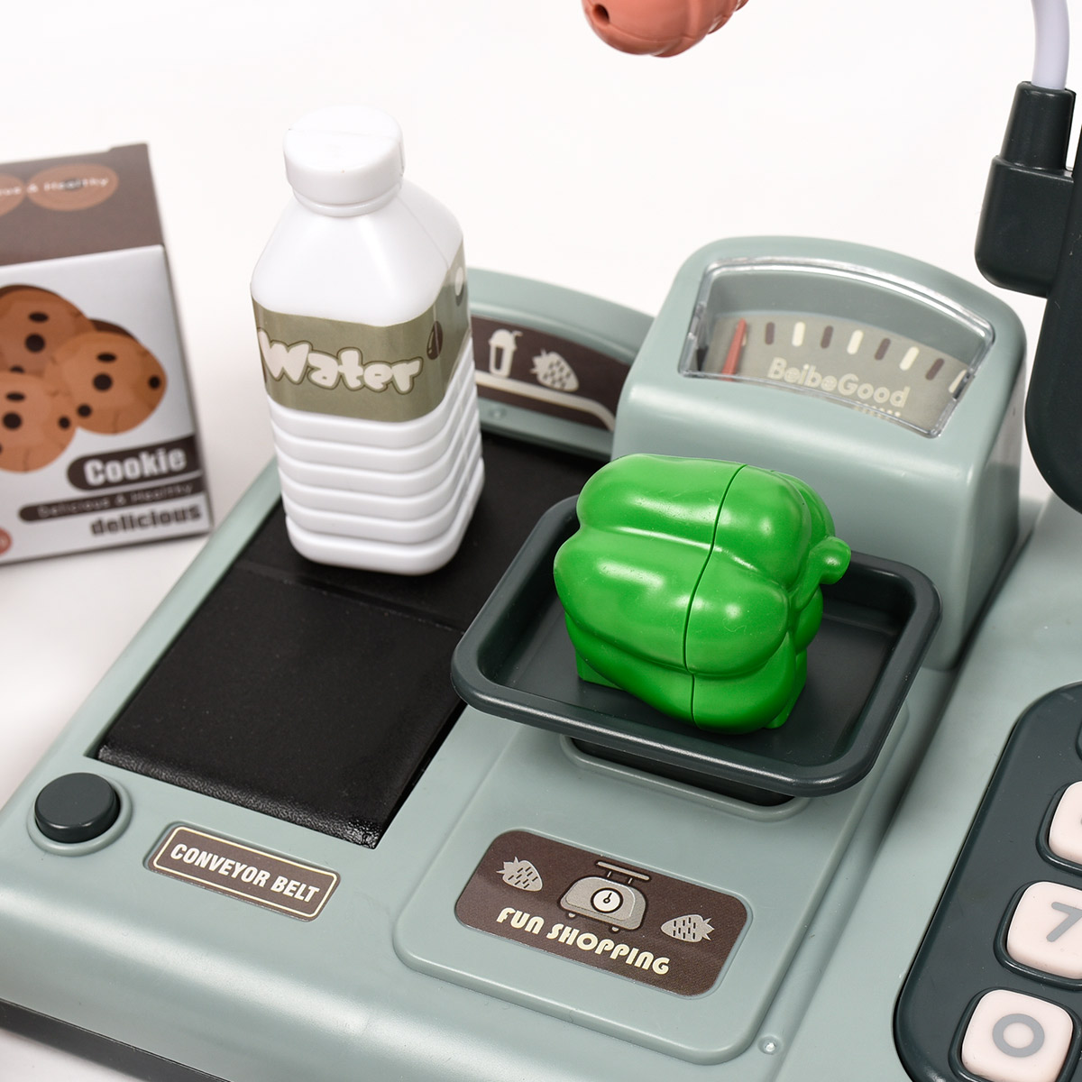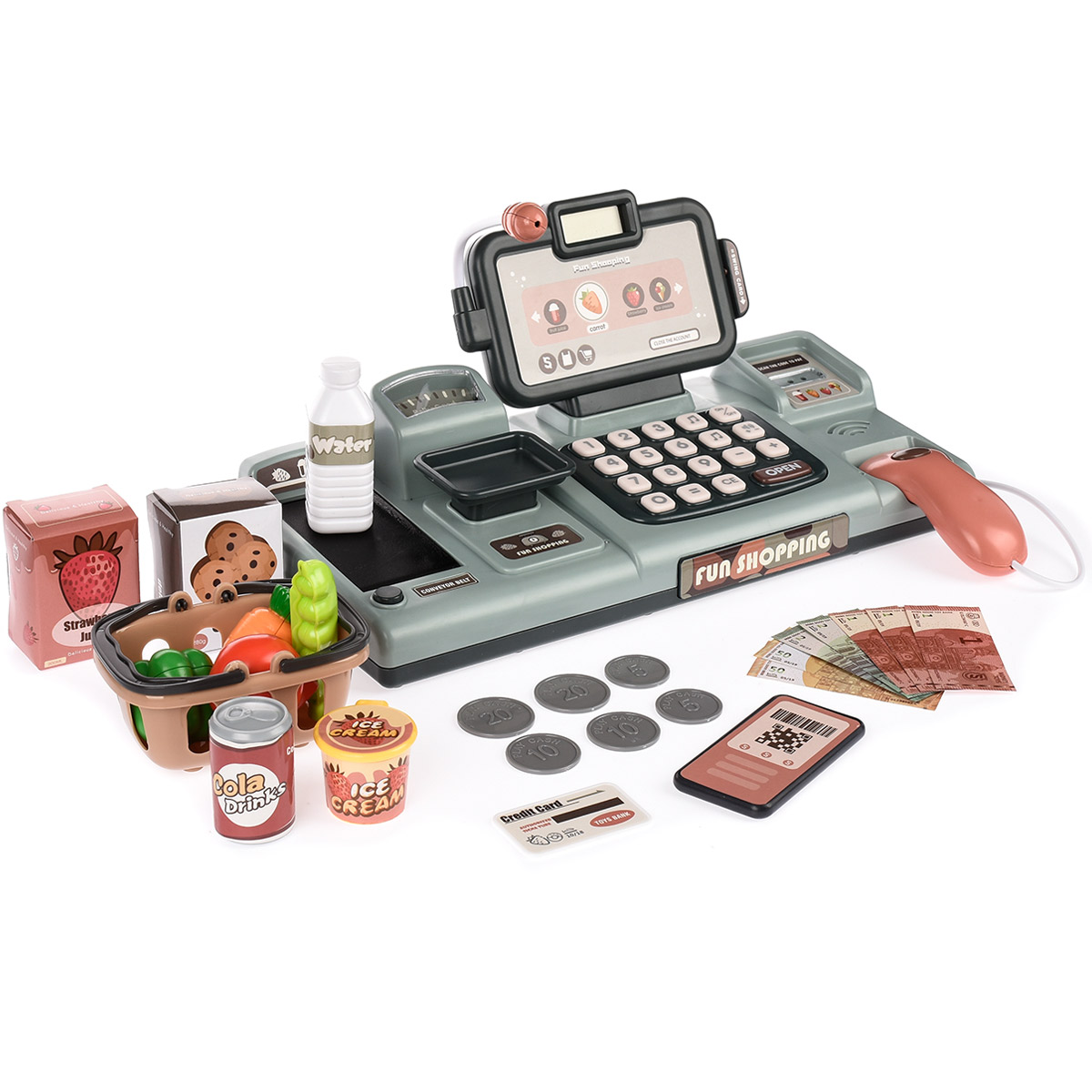 Das Kassenmodell ist ein interaktives Spielzeug aus sicherem Kunststoff, das die Fantasie und Kreativität der Kinder fördert. Das Set enthält viele farbenfrohe Elemente, sodass Kinder sowohl in die Rolle einer Kassiererin als auch eines Ladenkunden schlüpfen können.