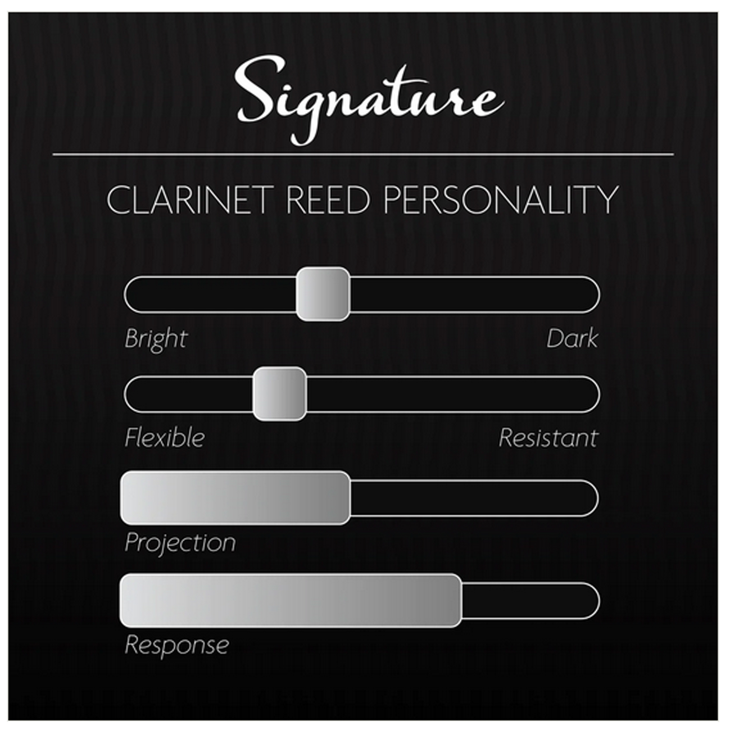 • CLEAR AND EXPRESSIVE SOUND. The Signature for clarinet reeds are perfectly centred. They produce a warm, rich tone in all registers of the instrument. They are cut thinner and are stiffer than natural cane generating a clear, focused sound requiring minimum effort from the player.