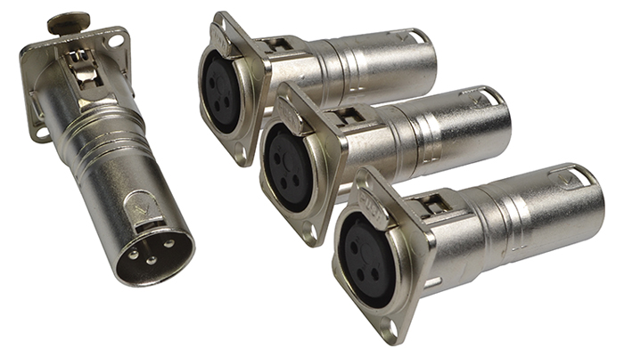 Pack of 4 feed through connectors for panel mounting. A female XLR on the panel side, with a male XLR on the rear outlet. Using this makes it easy to interconnect panels using pre-made leads