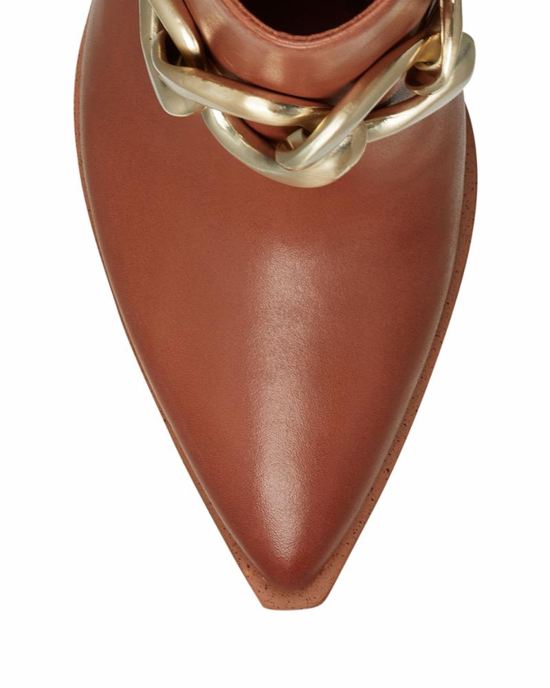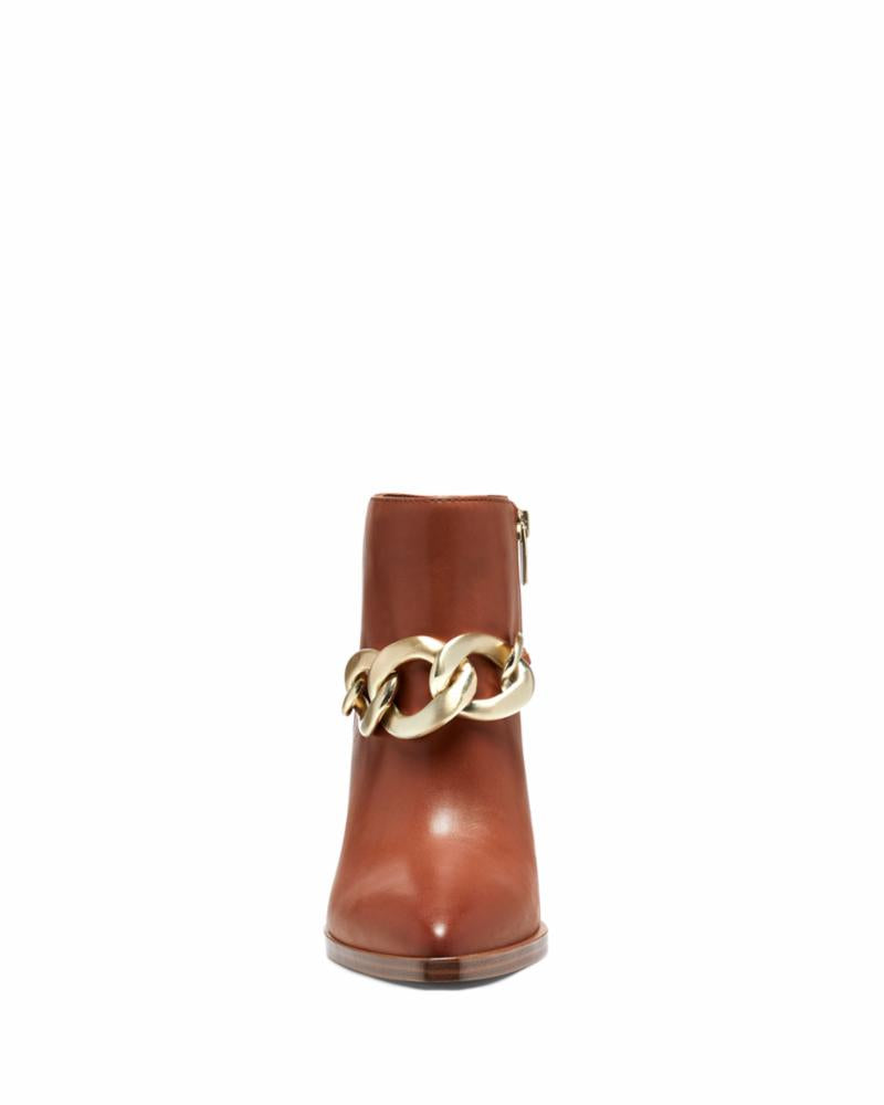A sophisticated design gets a glamorous update in the Gethel bootie. Made of leather, this ankle bootie is highlighted with a chain detail at the vamp and a stacked heel.