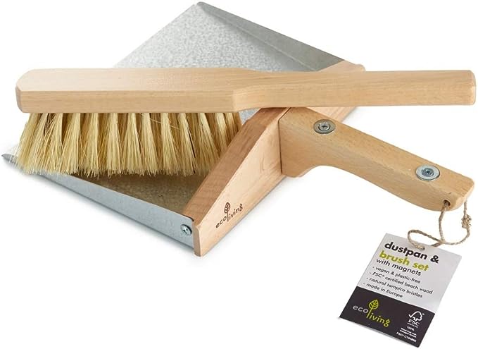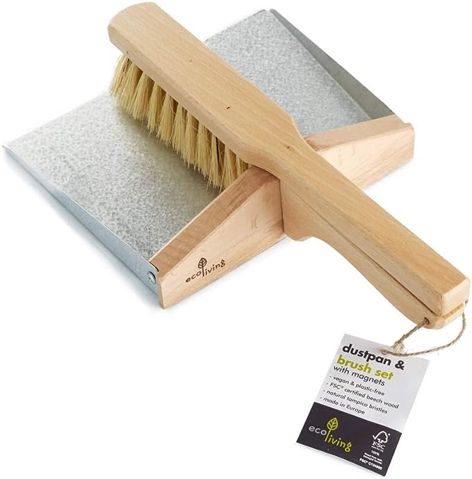 Dustpan & Brush Set with magnets. Vegan and plastic-free. FSC� certified beech wood natural tampico bristles. Made in Europe A plastic free dustpan & brush set, ideal for removing dust and dirt from your home. This dustpan and brush are held together with 2 magnets for easy storage. Made of FSC� certified beech wood and natural vegan bristles with a steel pan. Plastic free Vegan FSC� certified Made in Europe Tree planted for every brush sold