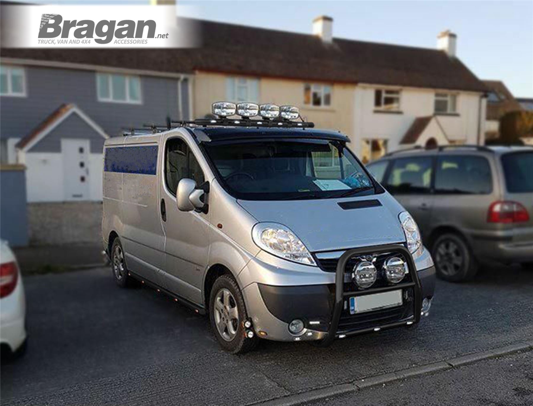 High-quality Black powder-coated Front Roof Bar with Jumbo LED Spots x4 and White LEDs x5 for Fiat Talento (2016 - present model). This top-of-the-range bar will have your van looking top spec at a fraction of the cost of the genuine items but with the same high quality.