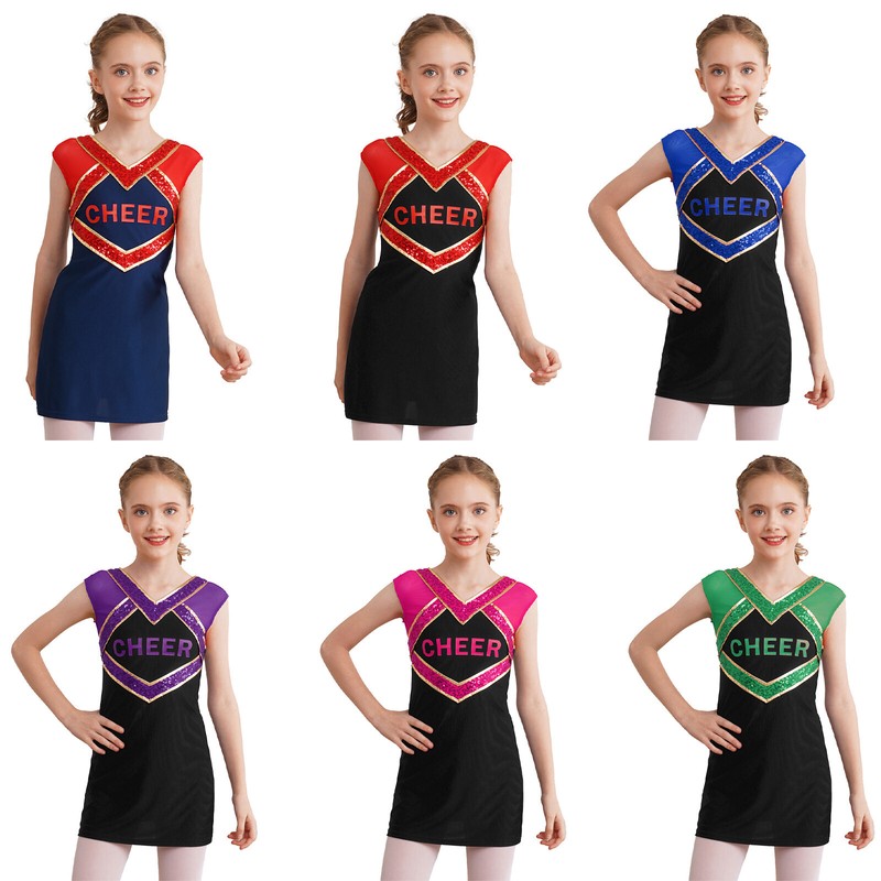 Dress features with sleeveless and round neckline, letter “CHEER” print in the front, patchwork style design.