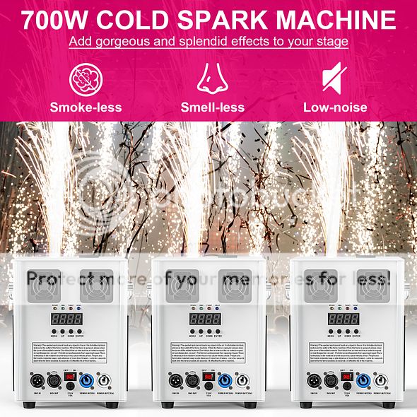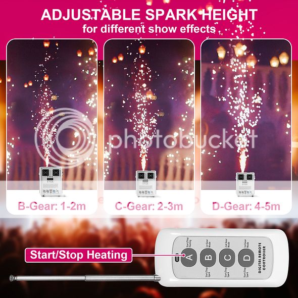 This fireworks machine supports max. 11.8 ft height spark, 3-level height adjustable. Spark direction: up; you can control the various effects within 49 ft with the controller