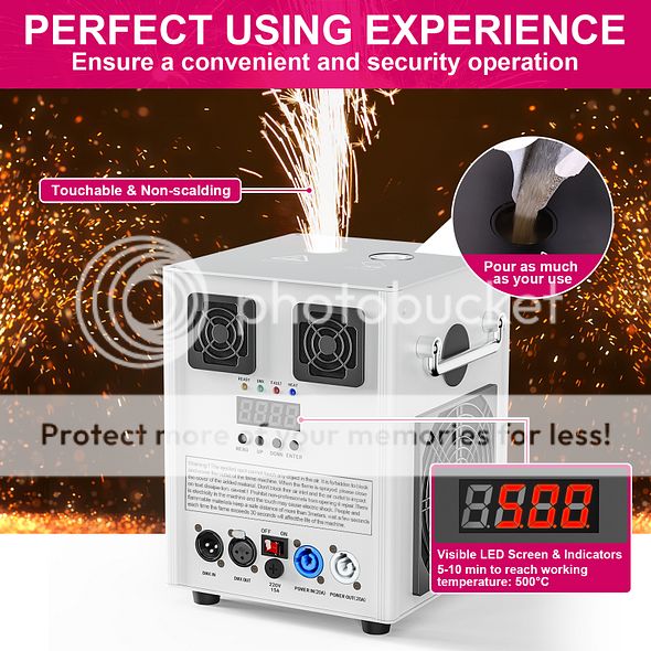 After pressing the start button, the cold spark machine gets heating to reach the working temperature in about 5-10 minutes to offer a charming lighting show.