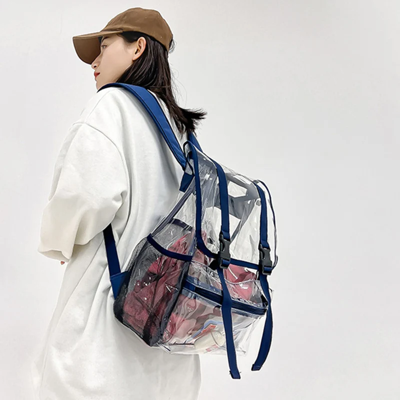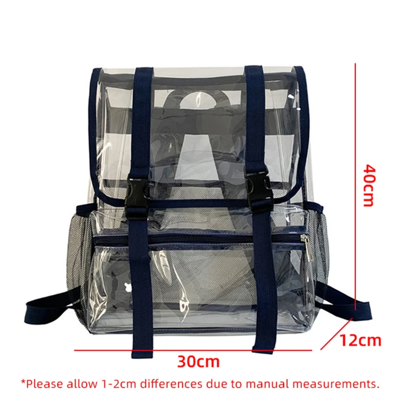 Feature: 1. Robust and durable: This bag is made of PVC material, which is wear-resistant, waterproof, lightweight, breathable, scratch resistant, easy to fold, easy to clean, and has no peculiar smell. The shoulder strap can be adjusted to the most comfortable state according to different heights and body types. Zipper closure is more secure and waterproof. 2. Large capacity: size: 30 * 12 * 40 cm. This backpack contains many pockets, large capacity, and can accommodate items such as mobile phones, tablets, wallets, water glasses, umbrellas, books, cosmetics, and more. Multiple pockets and large capacity, perfect for going shopping or playing. 3. Transparent design: This backpack is transparent in design, with different colors of cloth edges on the outside, fully in line with the current trend. 4. Suitable for various occasions: This backpack can be used on any occasion, such as shopping, travel, parties, business trips, work, and school. 5. Best Gift Selection: This student leisure bag is stylish and practical, making it an ideal gift for loved ones, friends, and family, on birthdays, wedding anniversaries, Valentine's Day, or any anniversary.