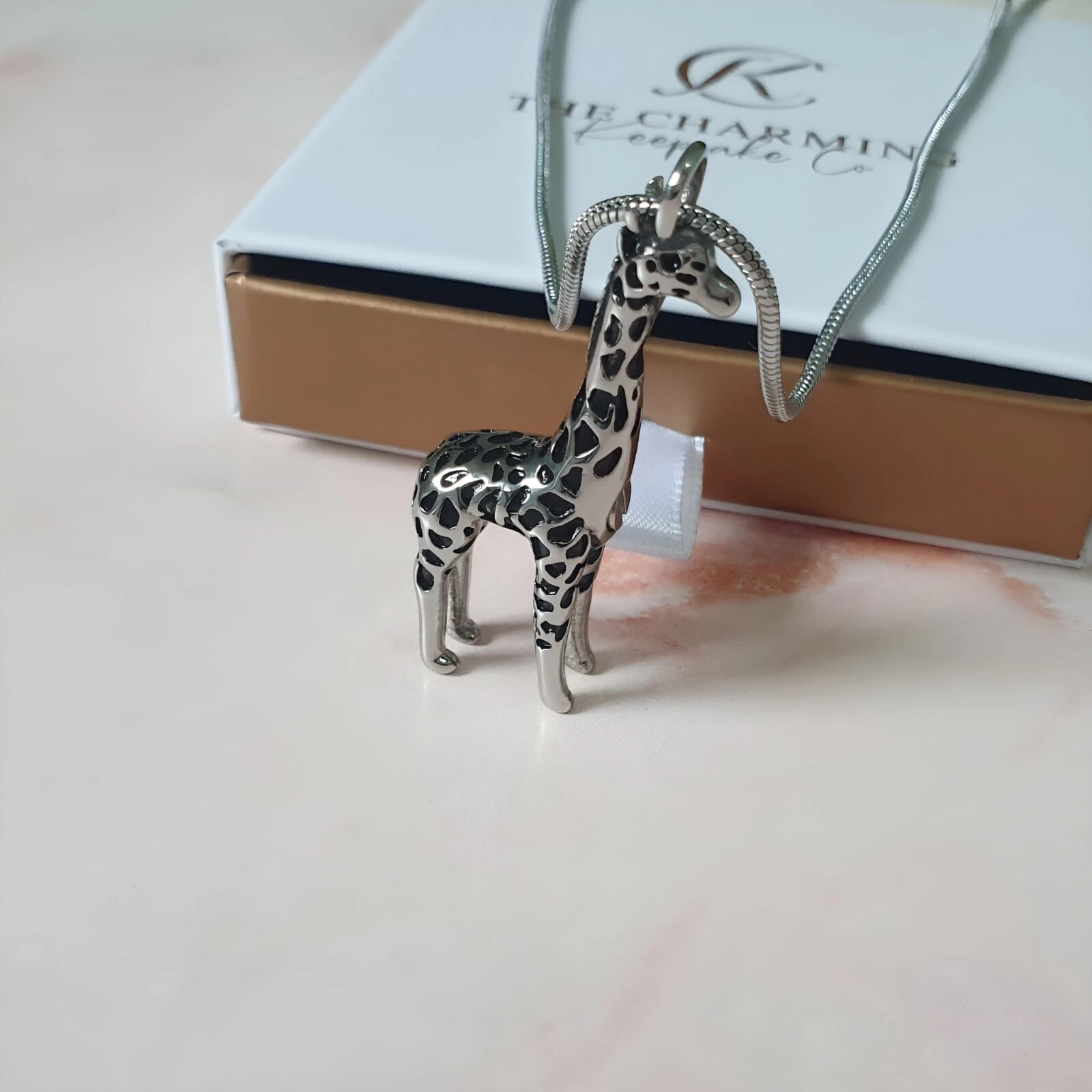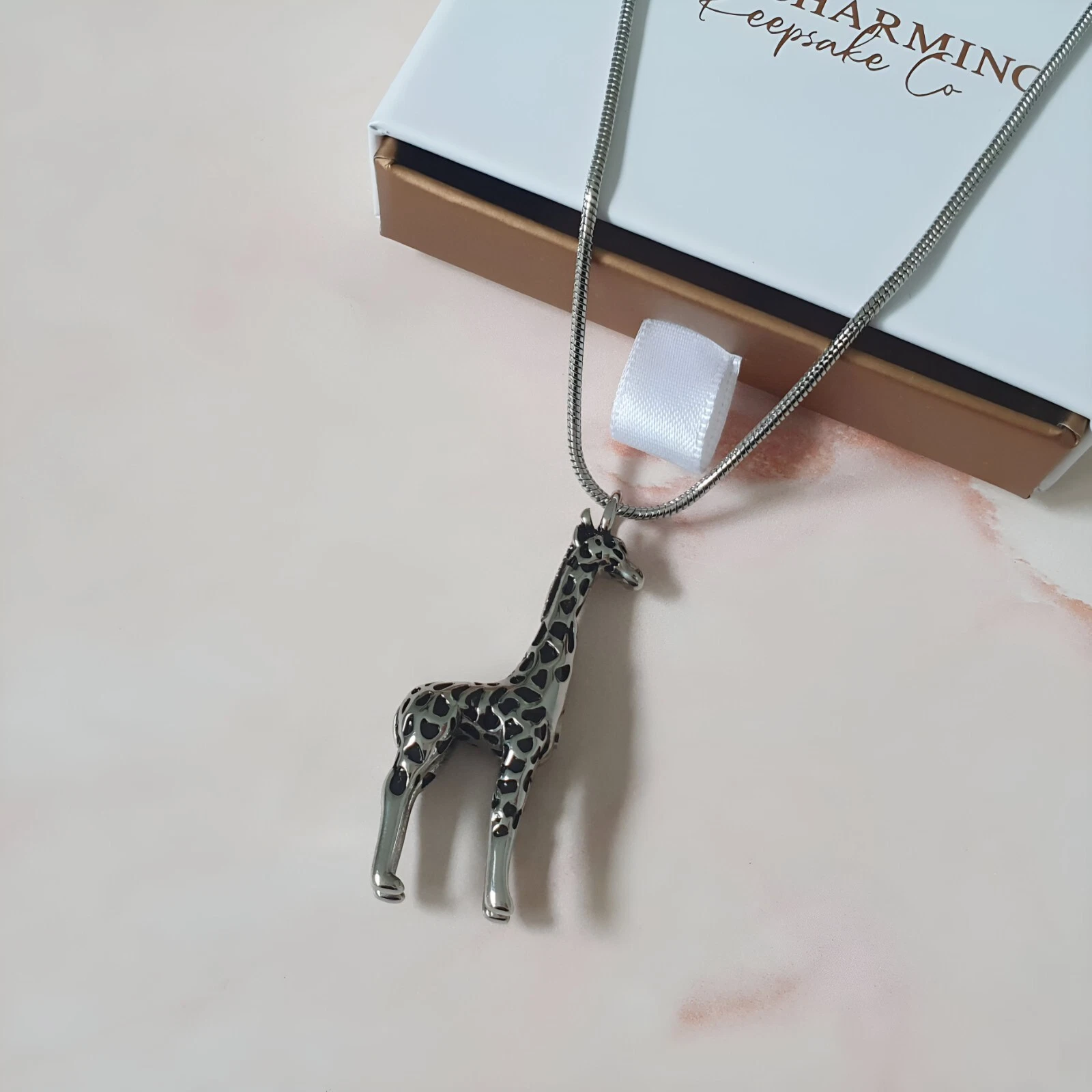 Keep your loved one close to your heart with this gorgeous Giraffe ashes necklace. The necklace is crafted from high quality polished stainless steel and features a Giraffe decorated with black enamel spots. The necklace pendant unscrews to place a small amount of the ashes inside. It also comes with a funnel kit and instructions.