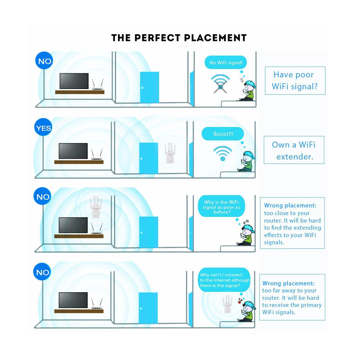 EASILY FIND THE PERFECT SETUP SPOT - Smart signal indicator helps you to find the best location for wifi coverage. This WiFi range extender can help you get rid of testing instantly and set up quickly. After extending successfully, you can relocate a perfect spot which can maintain a best extending effect.