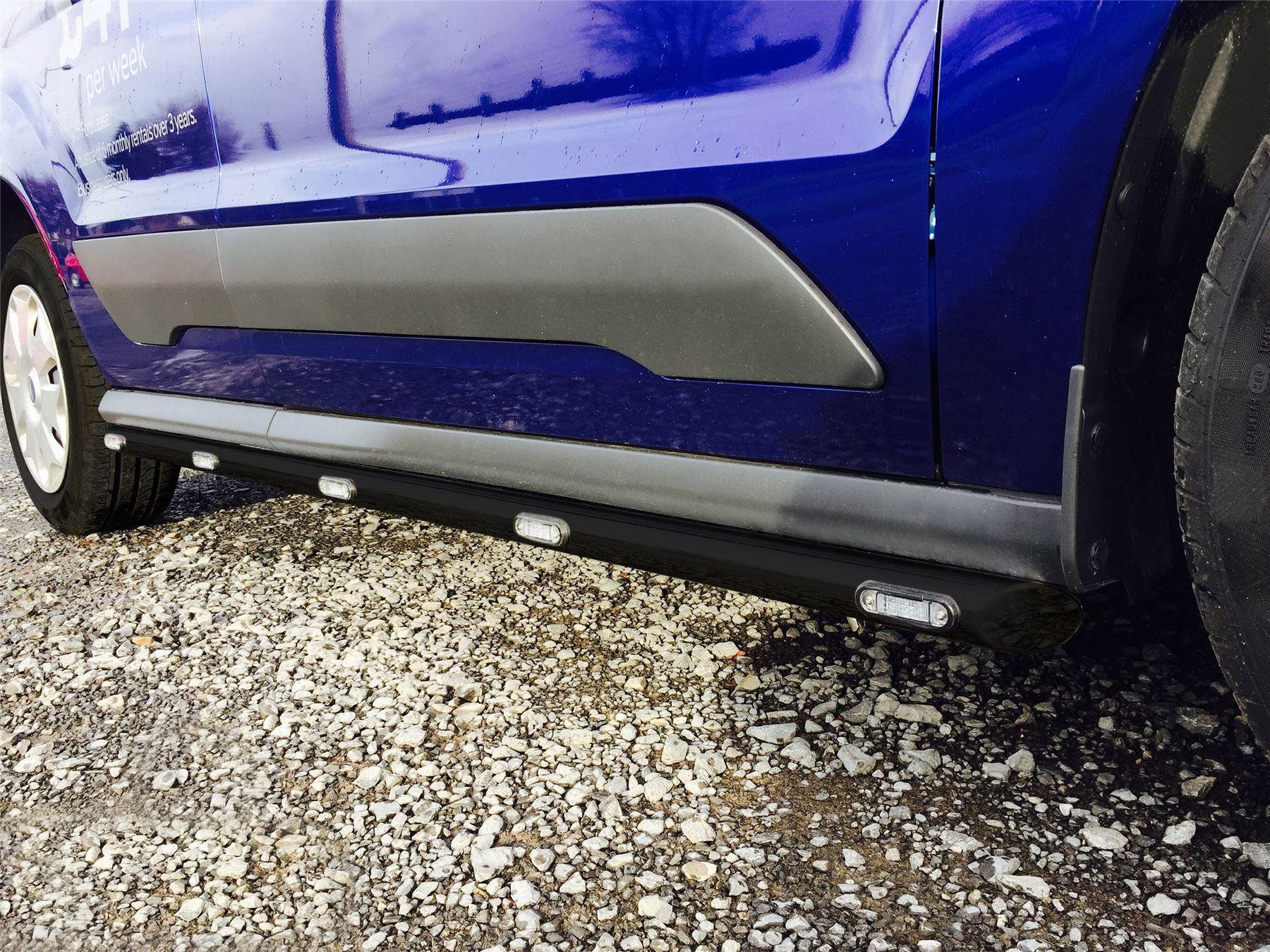 High quality SWB Ford Transit Mk8 Black Powder Coated Stainless Steel Side Bars - set of 2 (Pair) with 5 LED lights in each bar (2014 - 2021 model). These top of the range side bars will have your SWB TRANSIT MK8 looking top spec at a fraction of the cost of the genuine items but with the same high quality.