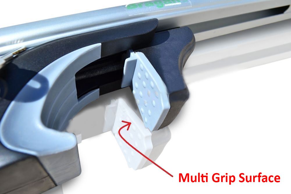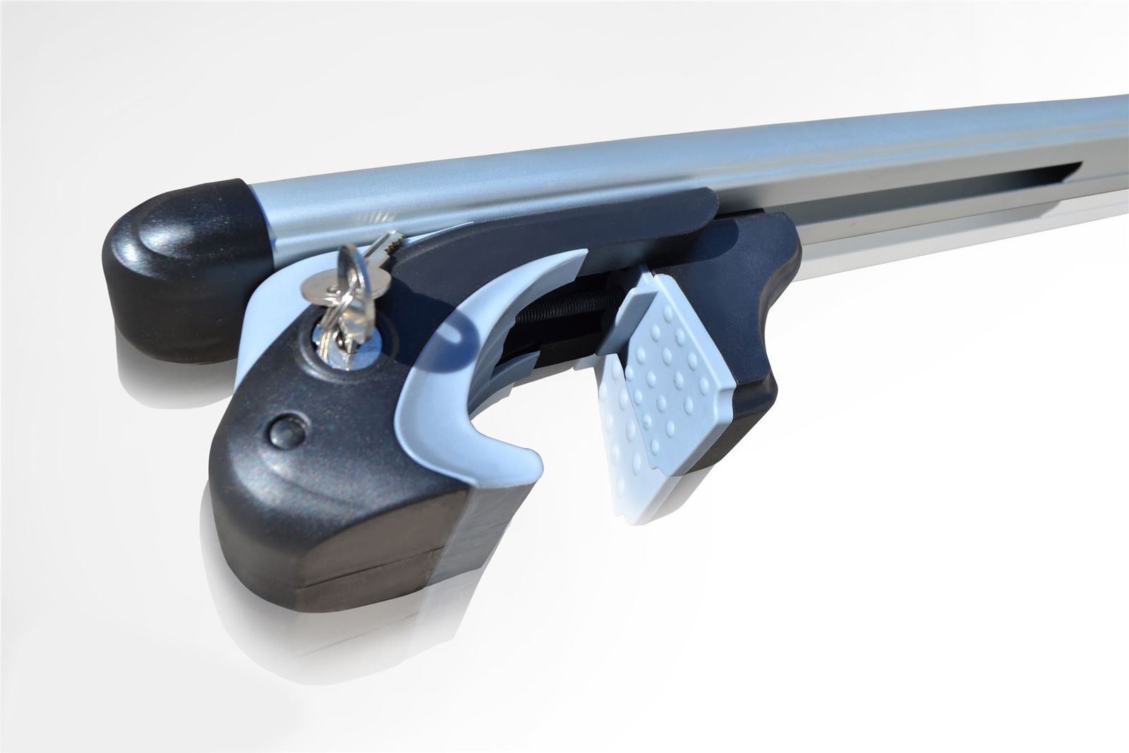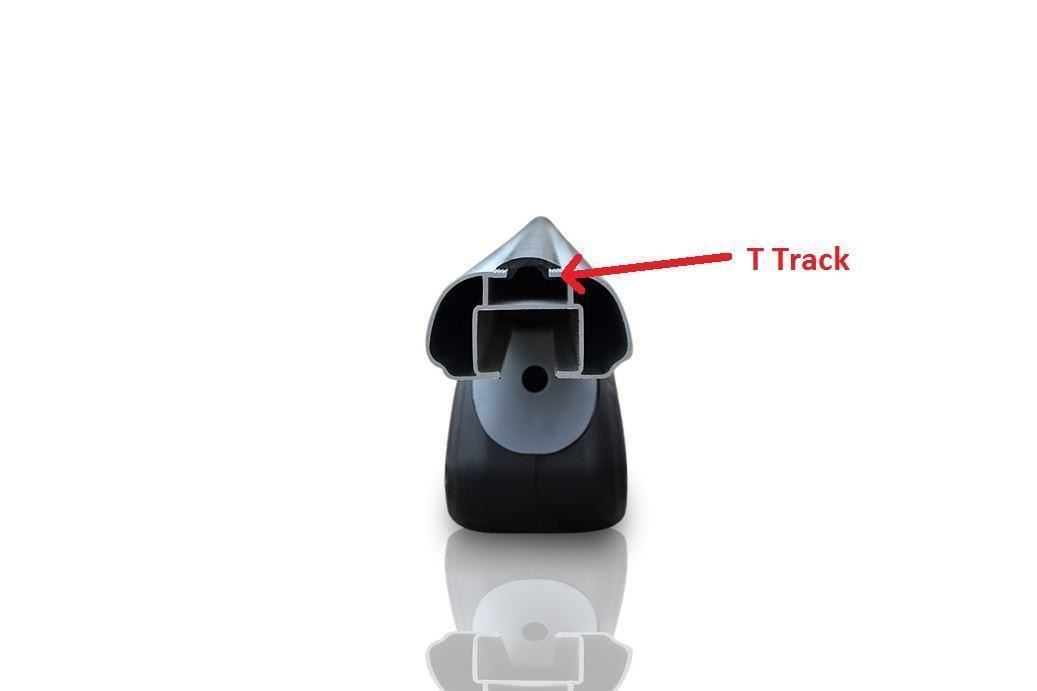 Manufactured from strong aluminium, light weight material and complete with lock and key for each rail, these cross bars clamp to the roof rails on your vehicle. The oval section of the roof bars include the standard T Track System for mounting accessories as well as the cleverly designed T-Pieces (optional use) which allow an array of accessories, roof boxes etc to be fitted with ease. The top side of the rail includes a moulded rubber strip to help stabilise items you may carry.