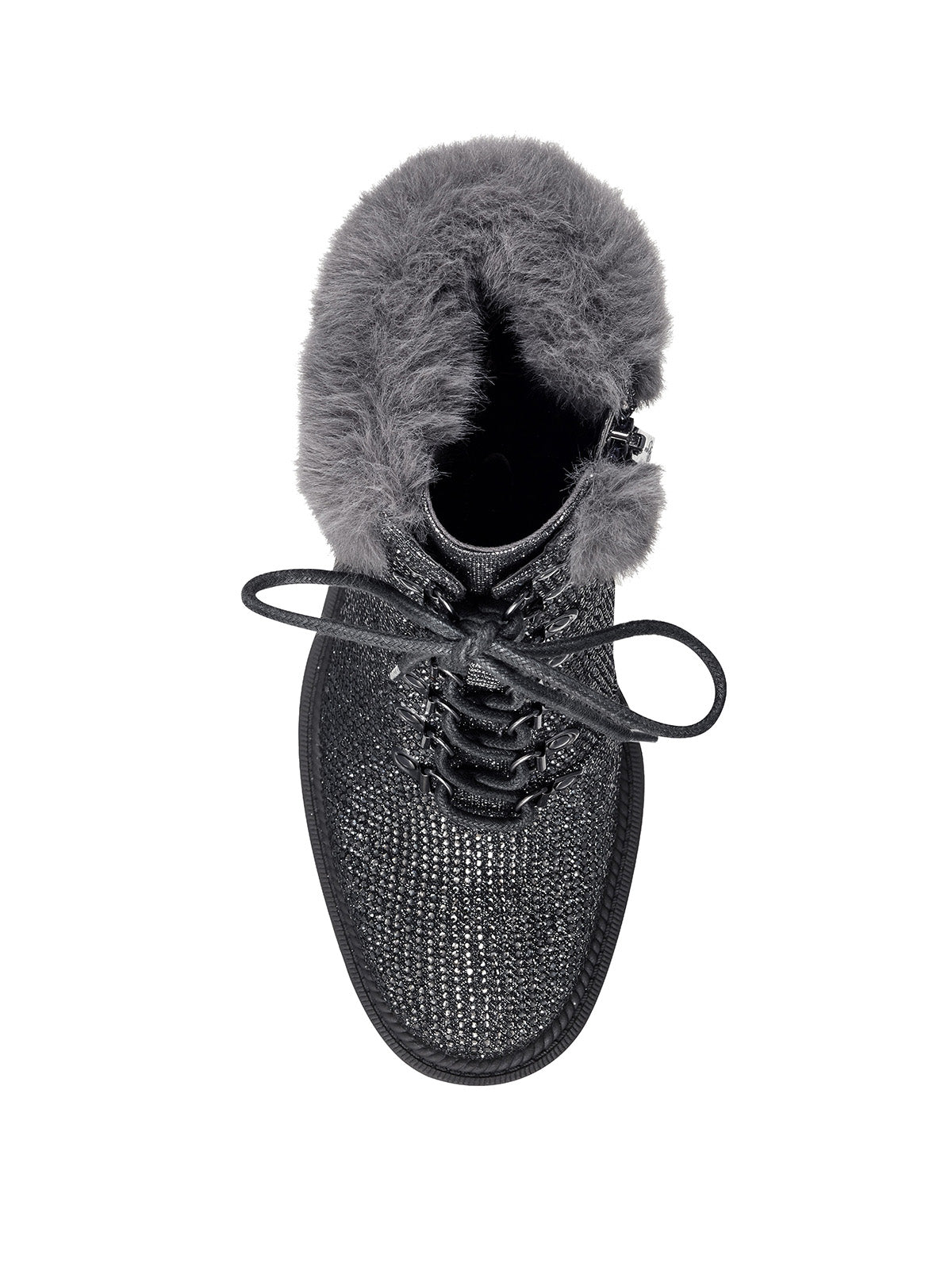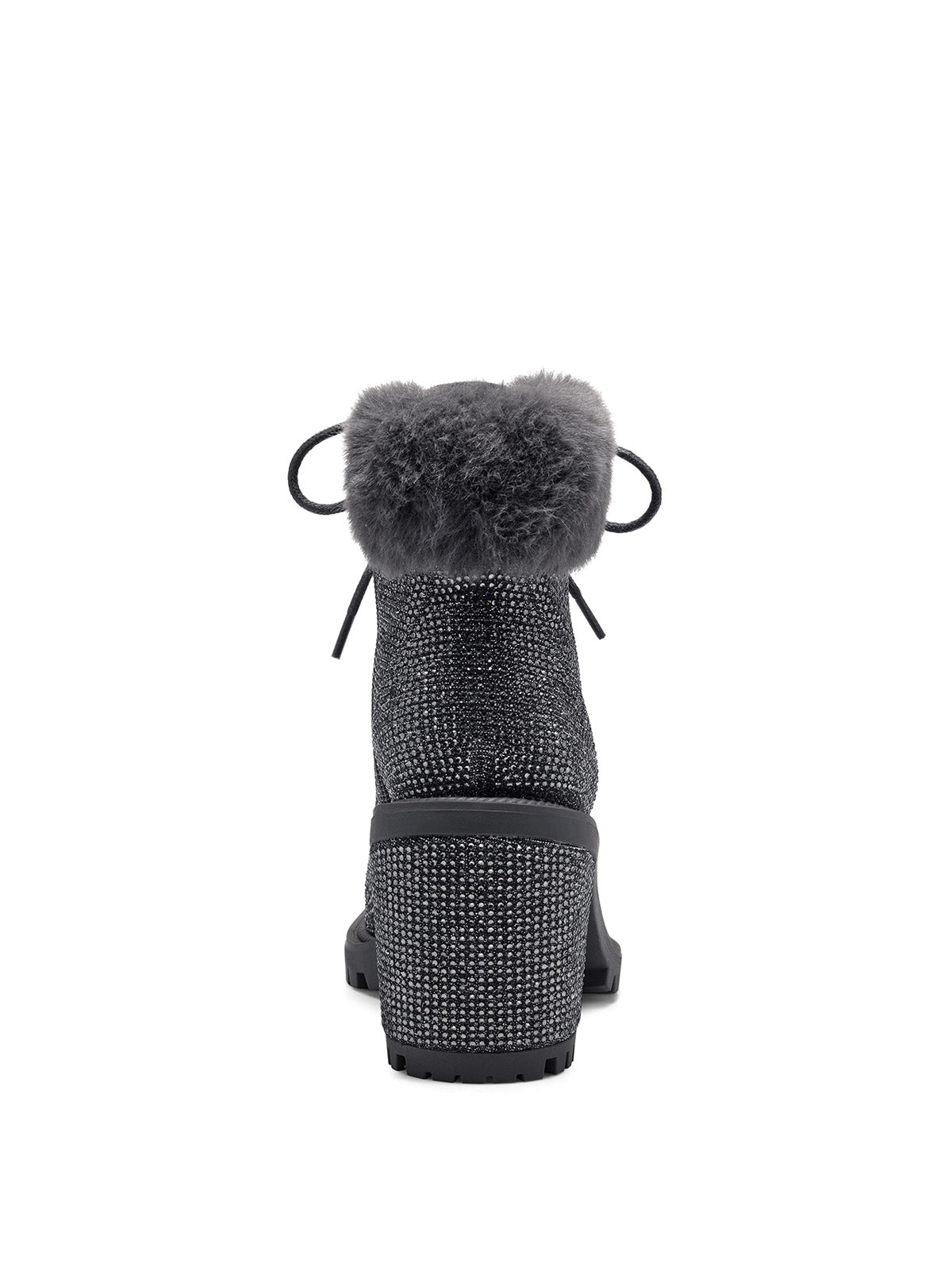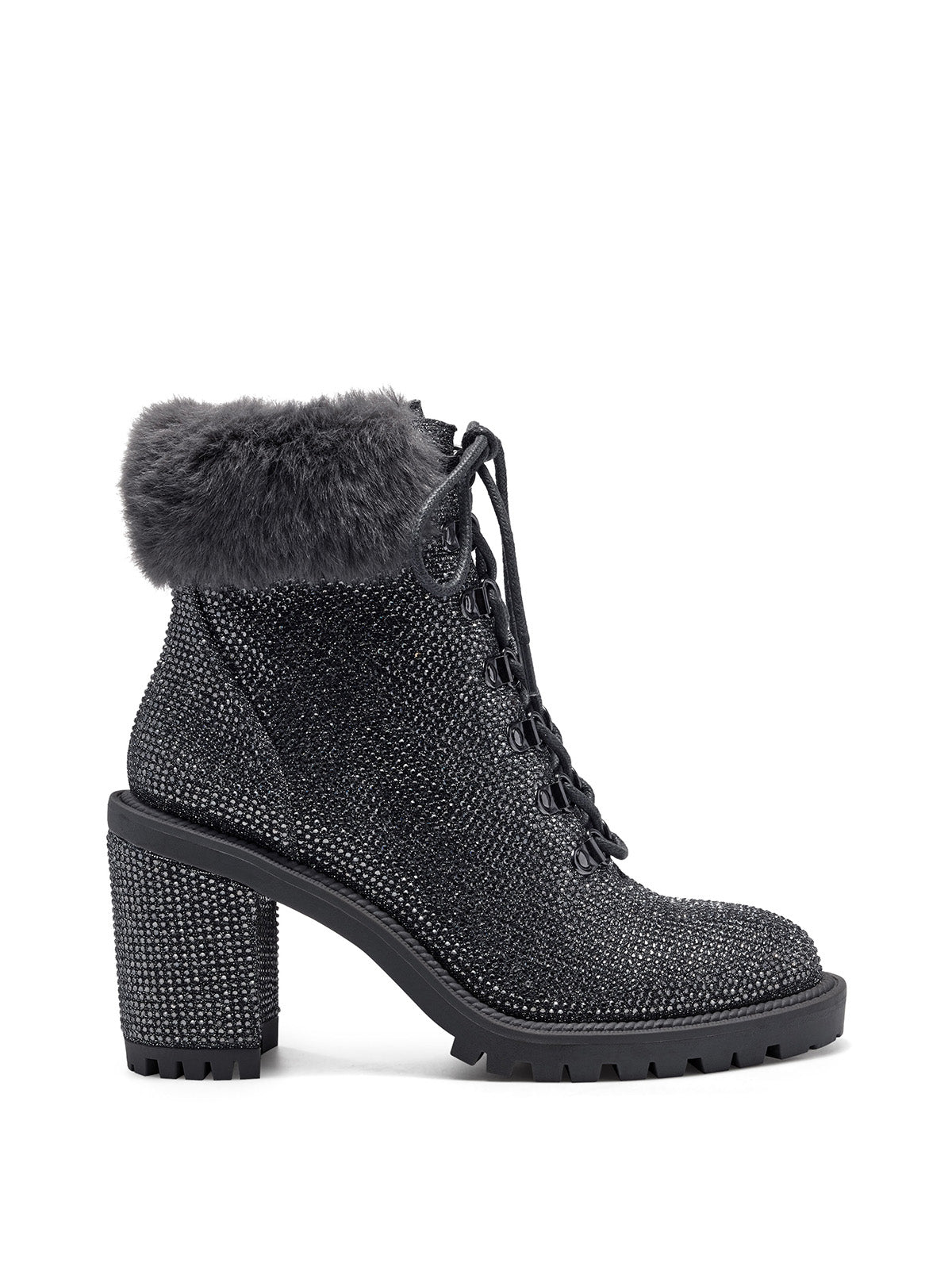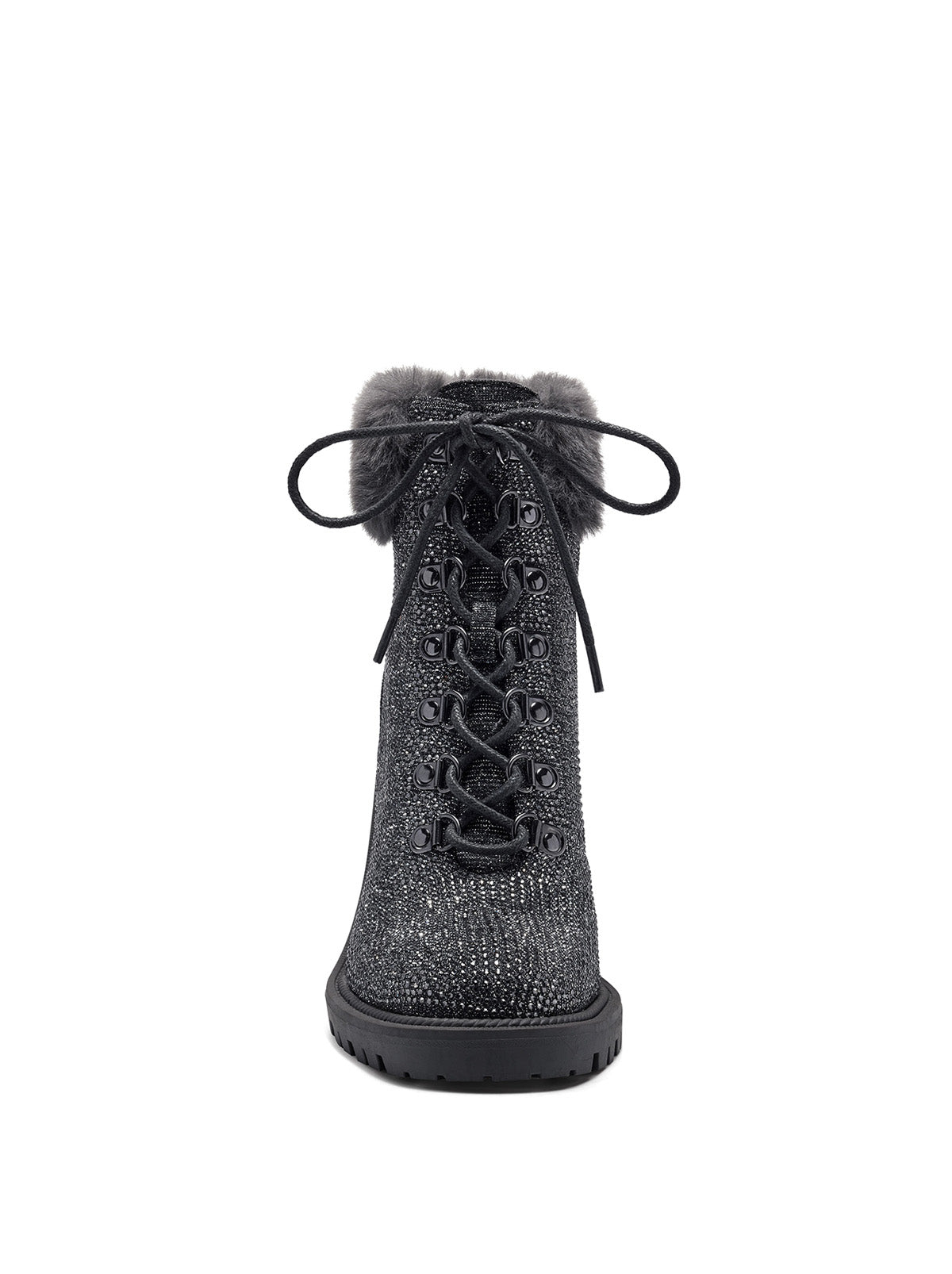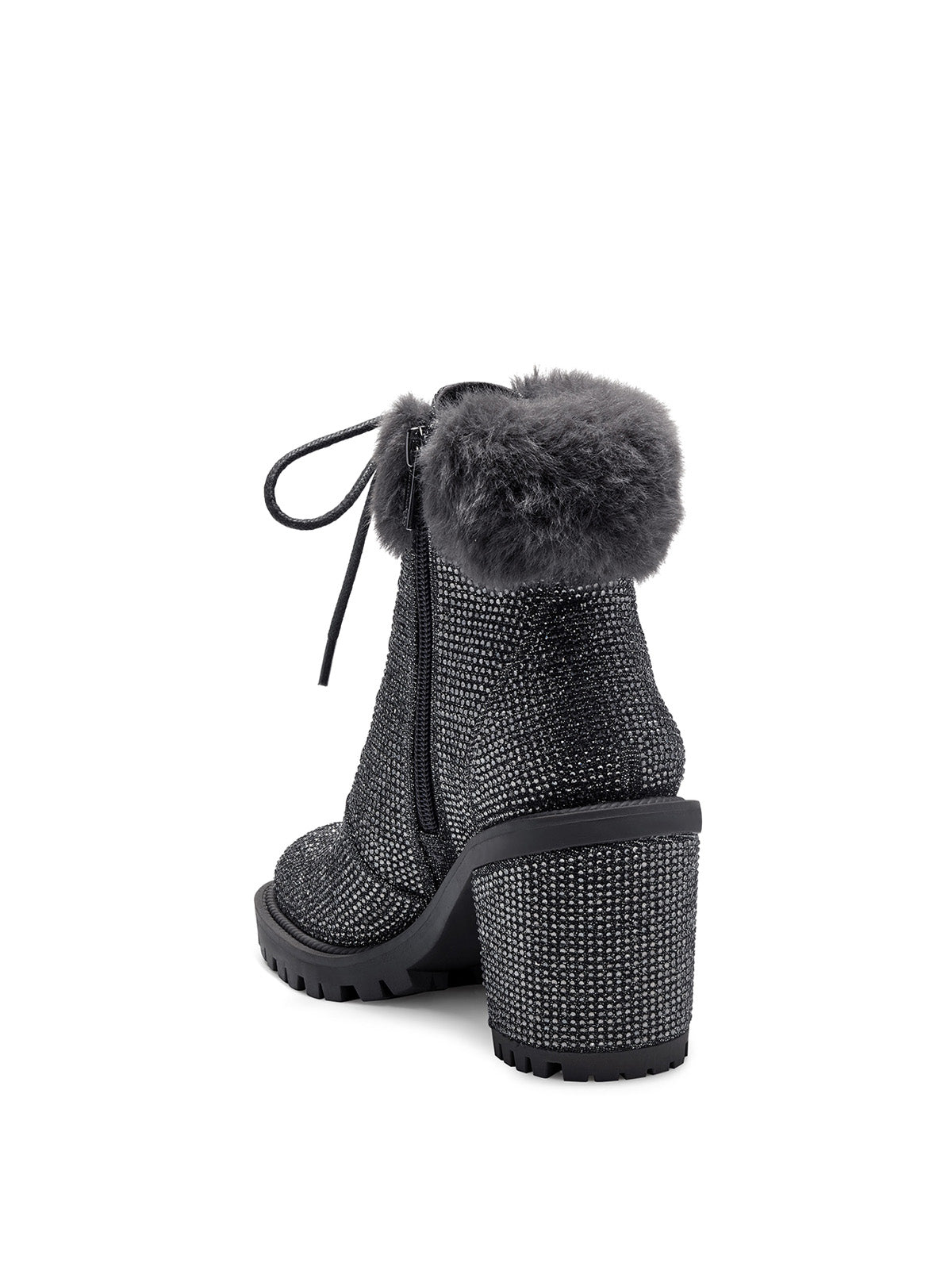 Give an impressive finish to your chic attire by pairing this Deliah bootie. Adorned with sparking embellishments, this lace-up bootie has furry collar and block heel that gives a sophisticated look.